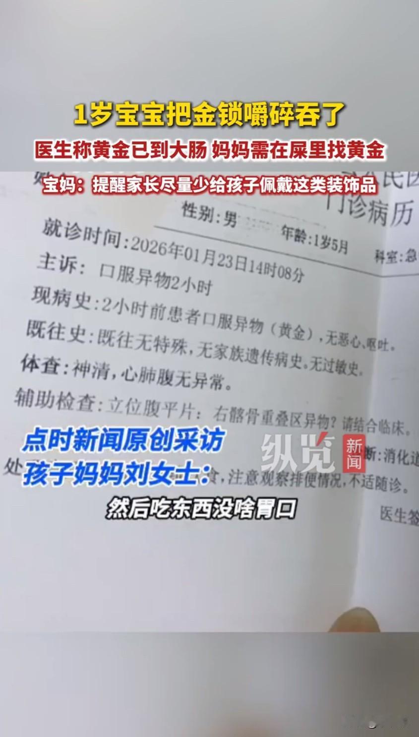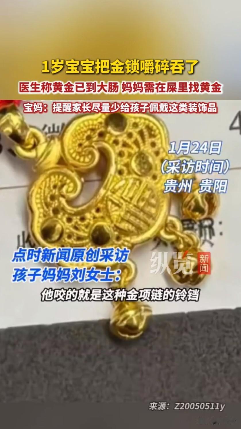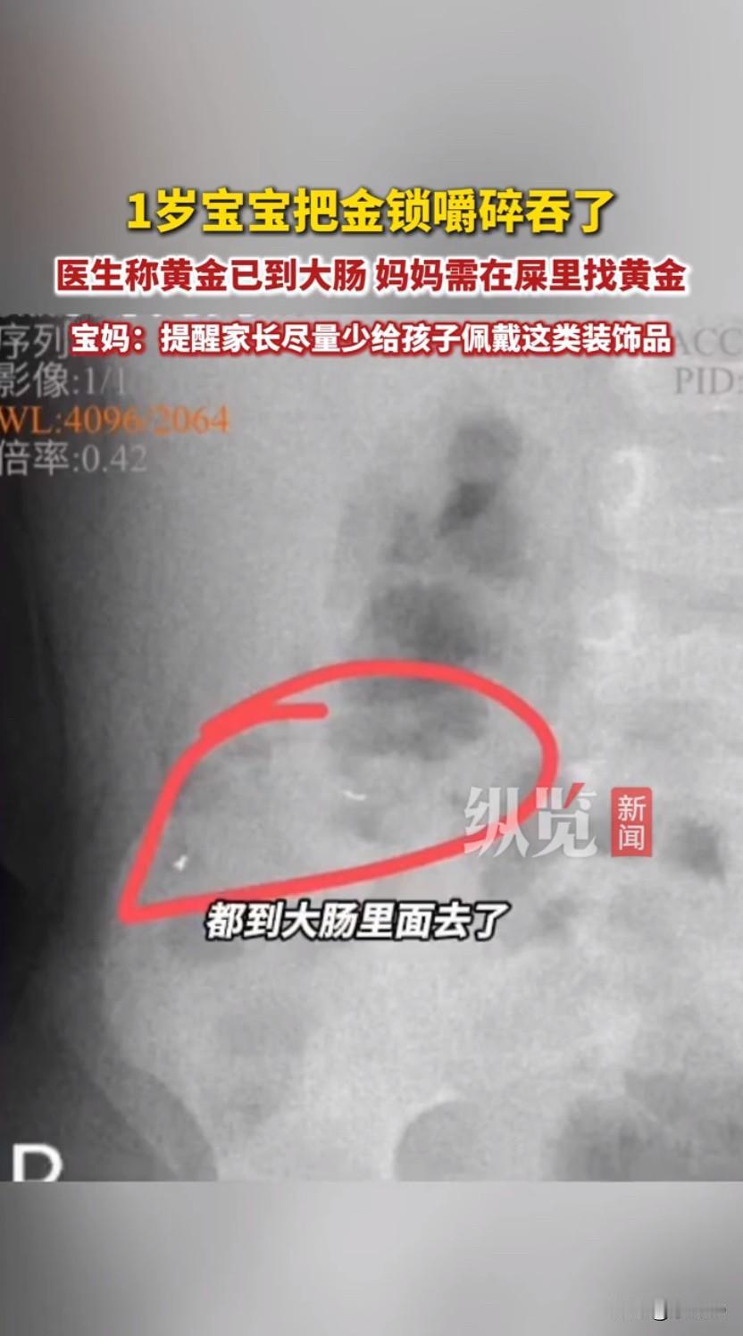 贵州贵阳的刘女士最近经历了一把惊魂时刻,家里一岁五个月的娃直接上演现实版“吞金兽”,把自己脖子上戴的金锁给咬碎了,还吞了部分碎金下肚,可把她吓得够呛。当天晚上刘女士忙完一天的事,关灯准备陪娃睡觉,刚躺下就听见孩子嘴里传来咯吱咯吱的咀嚼声,这动静听着不对劲,她赶紧开灯查看,这一看差点没把她魂吓飞。只见娃的小嘴里居然亮晶晶的全是黄金碎渣,再一看孩子脖子上戴的金锁,上面三个可爱的小铃铛全被咬得稀碎,不用说也知道,娃这是把金锁当零食啃上了。刘女士吓得手都抖了,立马伸手把孩子嘴里剩下的金子全抠了出来,可越清理越心慌,总觉得肯定有部分碎金已经被娃咽进肚子里了。一整晚刘女士都没睡踏实,心里总悬着一块石头,就怕碎金会伤到孩子的肠胃。第二天一早她照常给宝宝喂奶,更让她揪心的情况出现了,平时喝奶很积极的娃,这次却兴致缺缺,奶没喝几口就不碰了,就连喂辅食也没半点胃口,小脸看着也没往常精神。这下刘女士再也不敢耽搁,抱起孩子就往医院冲,一路上心都提到了嗓子眼,脑子里全是不好的念头,就怕孩子出什么意外。到了医院后,医生立马安排拍片检查,等待结果的那几分钟,刘女士感觉度秒如年,手心全是汗。好在拍片结果出来后,医生的话总算让她松了口气,医生说孩子目前没啥大碍,吞下去的碎金已经顺利进入大肠了,暂时没有堵塞肠道,也没出现划伤消化道的情况,不用过度担心。不过医生也特意叮嘱,接下来几天一定要密切观察孩子的排便情况,仔细检查粪便里有没有碎金排出,后续还要按时带孩子复查,一旦孩子有腹痛、呕吐等不适,必须立刻来医院。不少网友得知后都笑翻了,调侃这才是名副其实的吞金兽,还打趣刘女士这波是沉浸式体验“挖金矿”,也有宝妈感同身受,说养娃真是步步惊心,稍不留意就出状况。其实医生也科普过,黄金化学性质特别稳定,不会被胃酸溶解,只要形状圆润不尖锐,一般不会对肠胃造成伤害,大多能跟着粪便自然排出。但即便如此,刘女士还是不敢掉以轻心,毕竟娃才一岁多,肠胃娇嫩得很,她现在每天最要紧的事,就是盯着娃的便便仔细检查,就盼着能尽快把所有碎金都找齐。刘女士也忍不住吐槽,真是名副其实的吞金兽,同时也提醒其他家长,尽量别给低龄宝宝戴这类带小零件的金银饰品,尤其是带铃铛、吊坠的款式,娃正处于口欲期,抓到啥都往嘴里塞,很容易误咬误吞,一旦发生意外,真是又后怕又折腾。这件事也给不少家长提了个醒,带娃千万不能掉以轻心,那些看似寓意美好的饰品,一不小心就可能变成安全隐患。婴儿金饰 咬金锁 1岁宝宝误嚼金锁妈妈需屎里找金 宝宝误嚼金锁医生称黄金已到大肠 来源:纵览新闻