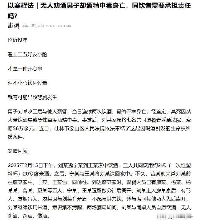 广西桂林,一男子和好友聚餐喝酒,首轮结束后被另一朋友拉去第二场接着喝,期间无人劝酒,可男子却因饮酒过量酒精中毒而离世。男子妻儿认为酒桌上7个同饮者都脱不了干系,一纸诉状将他们告上法庭,索赔56万,法院判决让双方都惊了。 2025年2月15号下午,刘某接到宁某和王某电话,说在王某家小聚,让他过去喝两杯。刘某没多想就去了,到那发现就他们仨,桌上摆着几瓶白酒。三人边喝边聊,从工作吐槽到家庭琐事,气氛挺热闹。 这场酒从下午三点喝到五点多,刘某已经喝了六七两白酒,脸也红得像关公。宁某和王某看他有点醉了,就说今天就到这,还把他送回了家。刘某老婆见他又喝多了,埋怨几句,扶他到床上躺着。 可刚躺下没多久,刘某手机响了,是曾某打来的。曾某在电话里说,廖某家今晚有聚餐,让他过去一起热闹热闹。刘某虽然有点晕,但想着都是朋友,不去不合适,就答应了。 刘某老婆不放心,说你这都喝成这样了,别去了。刘某摆摆手说没事,穿上外套就出门了。到了廖某家,屋里已经坐了5个人,廖某、李某、张某、赵某和孙某,大家正聊得开心。 刘某进门后,气氛有点微妙。原来廖某和刘某之前有点小过节,廖某看到刘某来了,脸色不太好看,没坐多久就找个借口离席了。剩下的人也没多想,继续喝酒聊天。 刘某见廖某走了,心里有点不痛快,再加上之前喝了不少,情绪有点上头。他也不管别人,自己拿起桌上的米酒,一杯接一杯地猛灌。其他人看到他这样,都有点惊讶,但想着他可能心情不好,也没劝阻。 没过多久,刘某就醉倒了,趴在桌上不省人事。其他人面面相觑,不知道该怎么办。傍晚时分,廖某回来看到刘某醉成这样,皱了皱眉头,喊了李某和张某一起,把刘某送回了家。 刘某老婆看到丈夫又被送回来,而且醉得更厉害了,心里又气又急。她把刘某扶到床上,给他擦了擦脸,想着让他睡一觉就好了。可到了晚上,她发现刘某呼吸很微弱,怎么叫都没反应。 她慌了神,赶紧拨打了120。急救车很快赶到,把刘某送到了医院。可医生检查后,无奈地摇了摇头,说刘某已经没了生命体征。 尸检结果显示,刘某是乙醇中毒死亡,血液乙醇含量超醉驾标准五倍多。 刘某老婆悲痛欲绝,她觉得都是那些一起喝酒的朋友害了刘某。如果不是他们喊刘某去喝酒,刘某就不会死。 她一纸诉状把曾某、廖某、李某、张某、赵某、孙某还有之前一起喝酒的宁某和王某,一共7个人告上了法庭,索赔56万。 刘某的妻儿说这些同饮者都有责任,没有尽到照顾义务。曾某则觉得很委屈,他说自己只是喊刘某来聚餐,没劝他喝酒,刘某自己要喝,他也没办法。 廖某也表示,自己和刘某有过节,看到他来了就走了,之后还喊人把他送回家,已经尽到了责任。其他人也纷纷辩解,说自己没劝酒,刘某喝醉是他们没想到的。 法院经过审理认为,刘某作为成年人,应该对自己的饮酒行为负责。他在已经喝了不少酒的情况下,还去参加第二场酒局,并且自己猛灌米酒,自身过错很大。 不过,曾某在刘某已经醉酒的情况下,还喊他去参加酒局,存在一定的过错。法院最终判决曾某承担5%的责任,赔偿刘某妻儿2.8万,其他6个人无责。 对于这个判决结果,刘某妻儿觉得太轻了,他们无法接受丈夫就这样没了,还只得到这么一点赔偿。 而曾某和其他同饮者也觉得冤枉,他们觉得自己根本没做错什么,却要承担责任。 从法律角度讲,共同饮酒者之间确实有一定的安全保障义务,但这种义务不是无限的。 刘某作为完全民事行为能力人,应该对自己的行为负责,不能把责任都推给别人。 法院的判决既考虑了法律的规定,也兼顾了实际情况,是比较合理的。 对于这个判决,有人觉得合理,成年人就该为自己的行为买单,刘某自己不注意,不能全怪别人。曾某虽然喊了他,但也没逼他喝,承担5%责任已经不错了。 但也有人觉得不合理,曾某只是喊刘某来,又没劝酒,让他承担责任有点冤。而且刘某老婆作为家属,也有一定的监管责任,不能把责任都推给同饮者。 还有人认为,法院判决体现了法律的公平公正,既考虑了刘某自身的过错,也考虑了曾某的轻微过错。这给社会一个警示,以后组织酒局或者喊人喝酒,得考虑对方的身体状况,不能盲目邀请。 在酒桌上,很多人觉得不劝酒就是不够朋友,可劝酒背后隐藏的风险却常常被忽视。一旦出现意外,同饮者往往难辞其咎。 其实,真正的朋友应该是在对方需要的时候给予关心和帮助,而不是在酒桌上拼命劝酒。喝酒应该适量,不能为了所谓的面子或者情谊,不顾自己的身体和安全。 ,在享受喝酒的乐趣时,也要承担起相应的责任。如果发现有人喝多了,要及时照顾,必要时送医,避免悲剧的发生。 对此,大家都怎么看呢,一起来讨论一下吧!