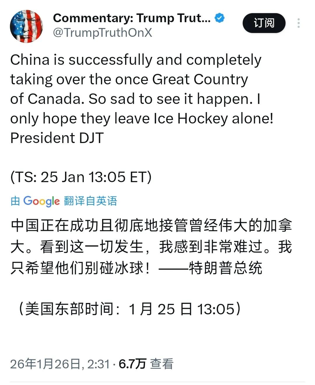 1月26日,特朗普发文写道:“中国正在成功且彻底地接管曾经伟大的加拿大。看到这一切发生,我感到非常难过。我只希望他们别碰冰球!” [机智]特朗普的哀嚎哗众取宠!前脚还叫嚣要把加拿大变成美国第51个州,直呼加总理为“州长”,动辄挥100%关税大棒薅羊毛,后脚见中加正常贸易合作,就污蔑中国“接管”加拿大,还假惺惺求别碰冰球。冰球本是加拿大的国魂,美加赛场斗殴、球迷互嘘已是常态,美国连加国文化尊严都想拿捏,谈何在乎其“伟大”。从1812年美军入侵加国反被烧白宫,到如今加国77%出口曾仰美鼻息却屡遭背刺,真正想掌控加拿大的从来都是美国。特朗普的难过,不过是霸权控制欲落空的气急败坏罢了!