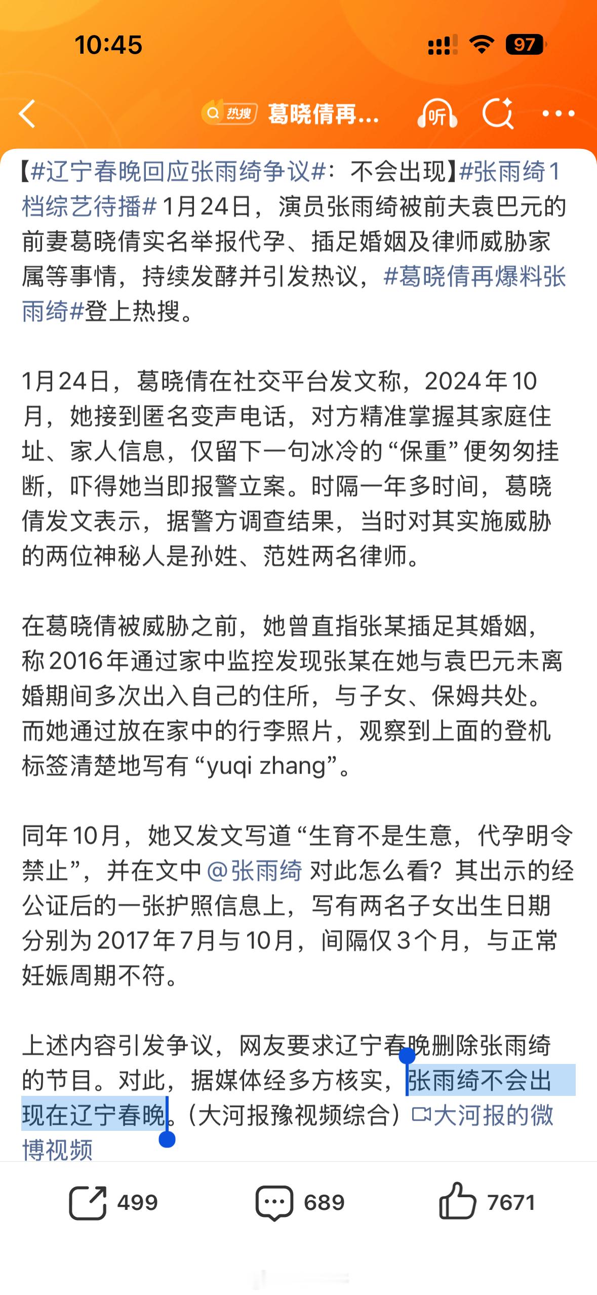 网友要求辽宁春晚删除张雨绮的节目代孕指控:前夫袁巴元前妻葛晓倩在直播中否认张雨绮