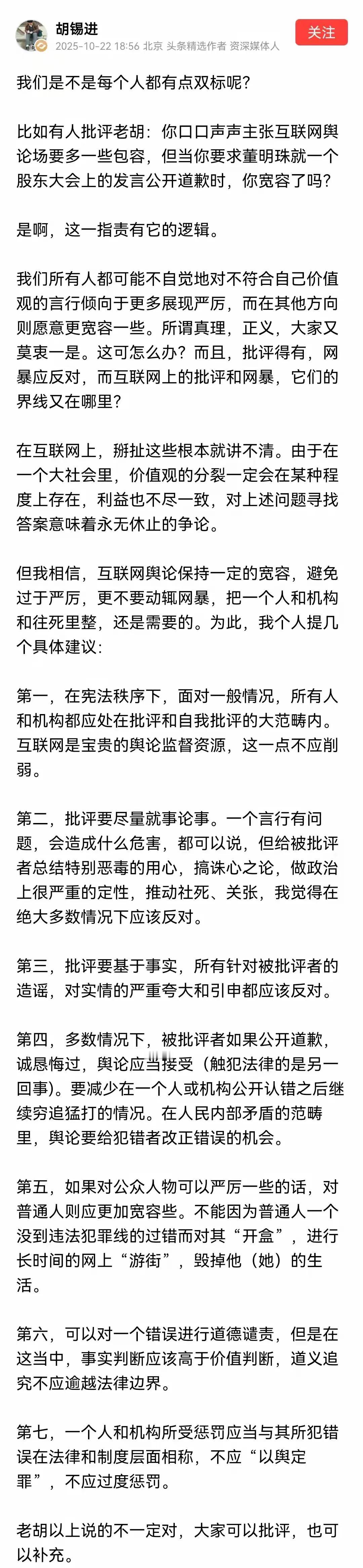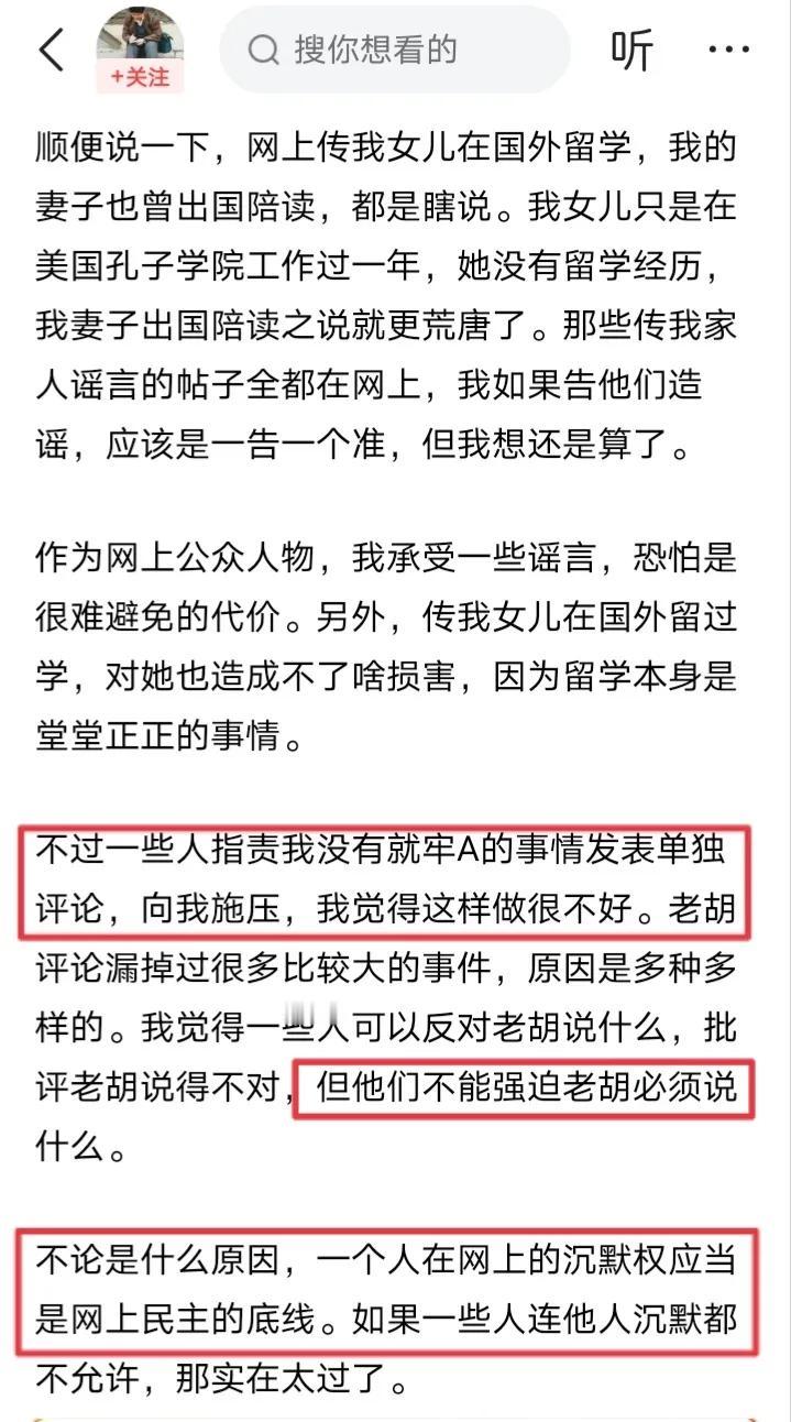 牢A提出的“斩杀线”在全网大热之后,胡锡进竟然针锋相对提出“沉默权”,这是怎么回事呢? 原来斩杀线理论直指美国社会对中下层民众的冷酷无情,这让从前吹捧美国的大小公知们颜面无存,尤其对任何热门事件都要尝尝咸淡的胡锡进,更是如鲠在喉、欲吐则不能。 胡锡进眼见纸包不住火,抵不住众多网友的舆情汹涌,老胡既不敢赞扬“斩杀线”理论的犀利,也不敢斥责“斩杀线”是胡说八道,真叫做左右为难。 胡锡进只好抛出“沉默权”,表示“他们不能强迫老胡必须说什么”,老胡声称“一个人的沉默权应当是网上民主的底线”。可见胡锡进好说歹说,就是不肯对“斩杀线”发表什么看法,而是企图用“沉默权”搪塞过去。 去年董明珠表示不敢录用留学生,因为担心有间谍。当时胡锡进蹦达的可欢了,公开要求董明珠公开道歉,那时的老胡一点都不沉默。 那么胡锡进从前张大嗓门喊喇叭,如今却捡起“沉默权”闭口不谈“斩杀线”,老胡是有什么难言之隐吗?