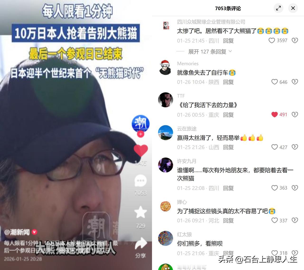 10万人抢1分钟告别,这泪里藏着成年人的刚需。 日本上野的大熊猫晓晓蕾蕾要回国了,最后参观日挤爆10万人,每人只能看1分钟。 有人连续4000天清晨5点守园门,拍熊猫睡醒的第一声哈欠,记录晓晓第一次爬树时爪子抠树枝的弧度,无关流量,只把熊猫当家人,把每天找差分的日子,过成了生活的锚点。 零下5℃的寒风里,有人排5小时队,攥着2011年的旧明信片,举着手幅哭到忘了按快门。有粉丝说,失业后空荡的傍晚是熊猫填满的,化疗时是它们的照片给了勇气。 这不光是舍不得熊猫,更是快被生活碾得喘不过气的我们,太需要这种每天都能看见的稳定温暖,不用算计投入产出,不用怕突然失去,就安安稳稳陪你长大,也陪你熬过难捱的日子。 下次见面不知道要等多久,但那些软乎乎的治愈,早成了心里的热可可。