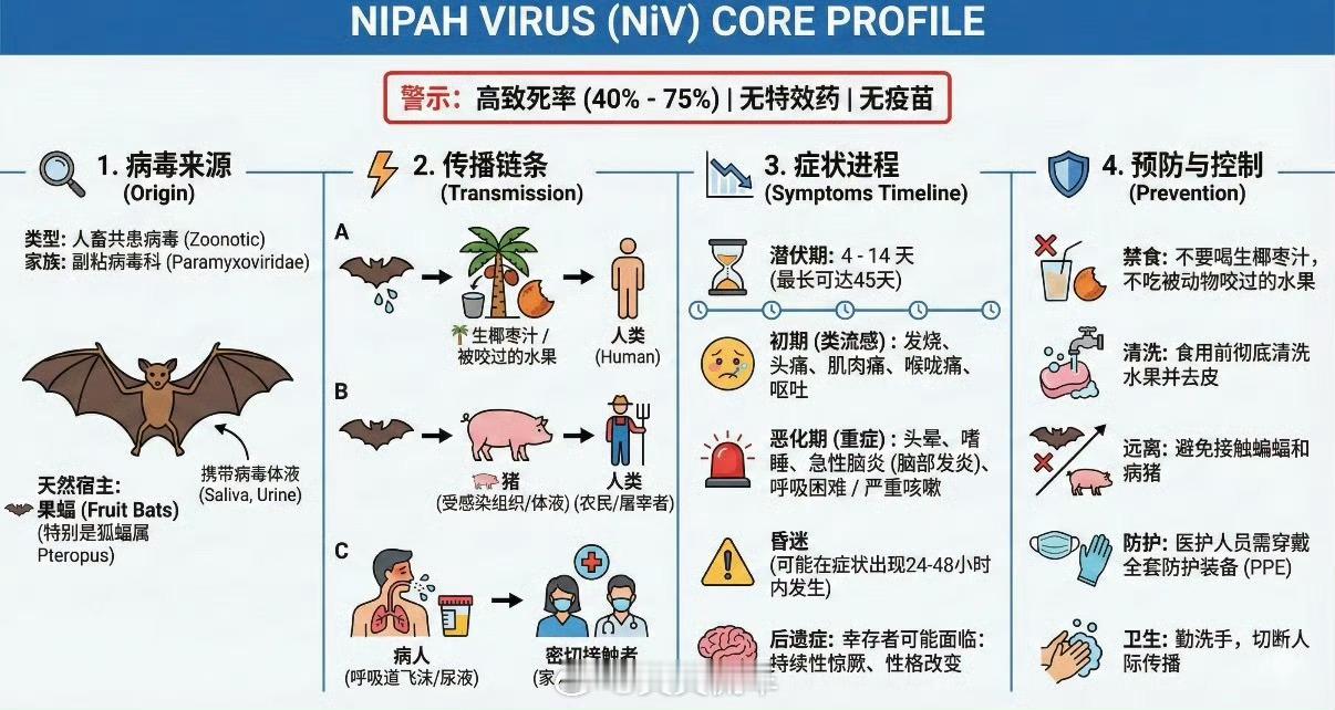 印度疫情1、症状早期类似流感:发热、头痛、肌肉酸痛。严重时可发展为脑炎,导致昏迷、呼吸困难,致死率高。2、治疗无特效药和疫苗。主要依靠支持性治疗,如呼吸机辅助、维持生命体征。3、防治个人:不喝生椰枣汁、不吃被蝙蝠污染的水果,避免接触蝙蝠/感染者。公共卫生:及时隔离病例,加强检疫,防止疫情扩散。虽然还没有大范围扩散,但也给大家提个醒,尤其是在国外的朋友们