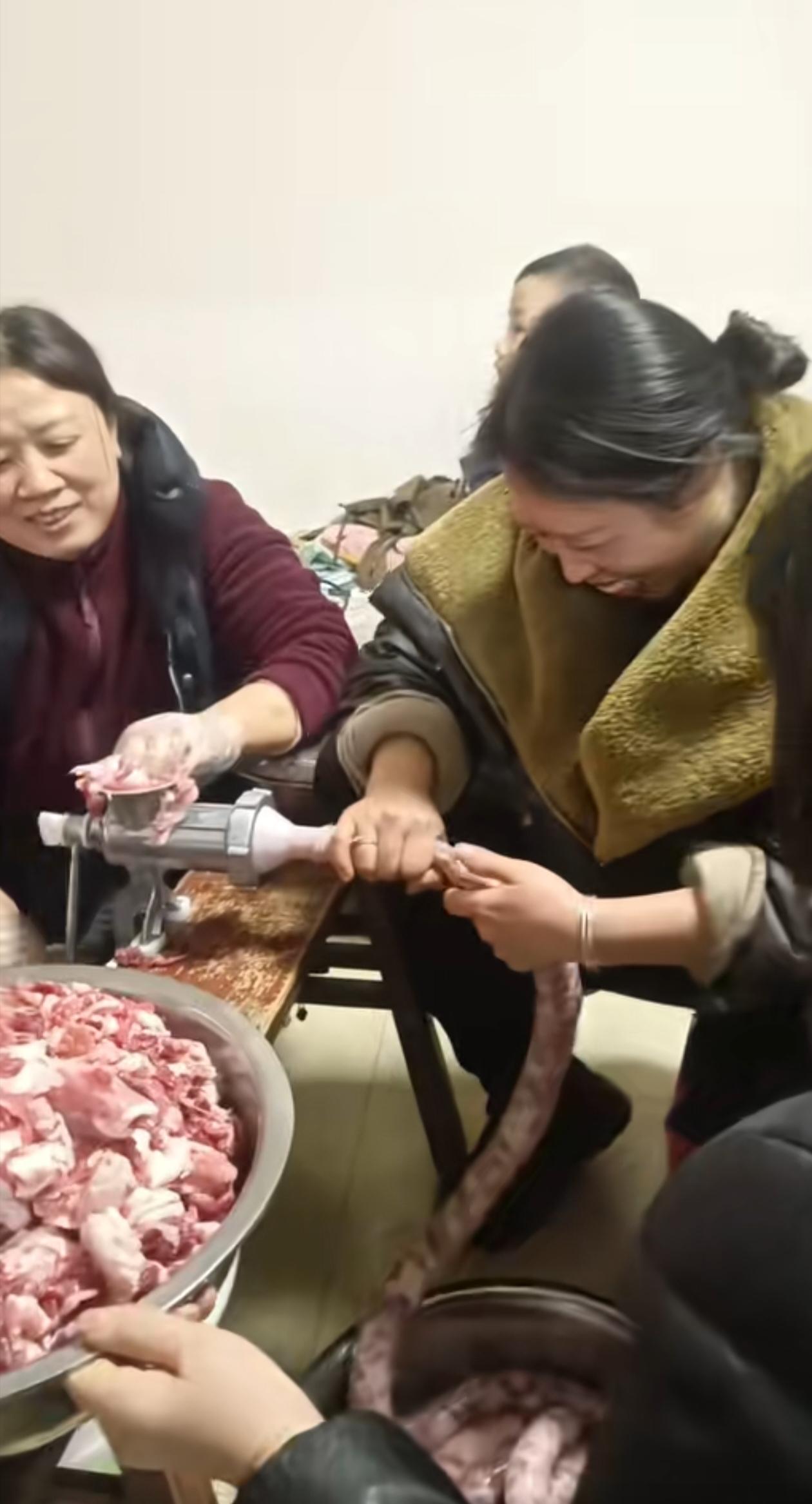 一群灌香肠的女人笑得很开心,合不拢嘴,她们的笑绝对是幸福的笑。我猜想有几点,一是今年买的猪肉太便宜了,是近十年来的最低价,所以买的多;二是他们今年肯定没少挣钱,收入多了有肉吃,肯定开心;三是用机器灌香肠好省力。你们觉得呢?