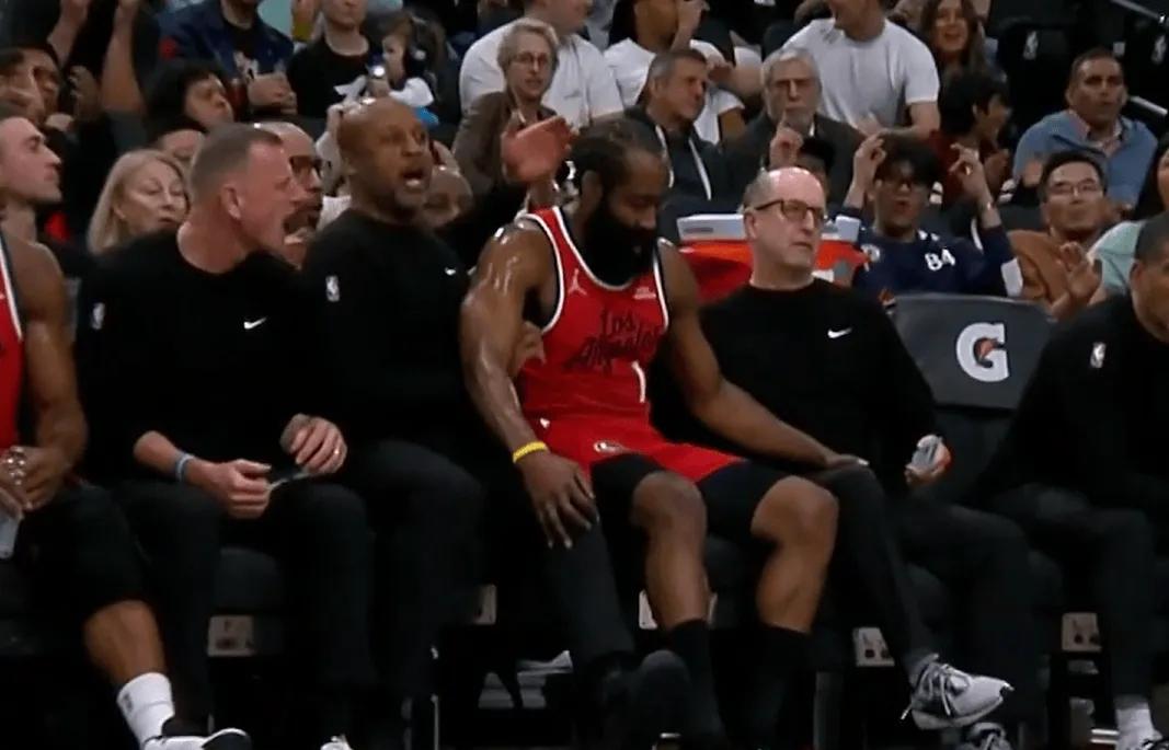 哈哈哈,哈登这个后撤步,撤的有点过了,跳投命中后为控制平衡直接坐在替补席了,甚至还跟还跟范甘迪聊了几句。弹幕上还有人说,范甘迪的口型像是在说“beautiful”。想起之前有一次湖人的比赛,东契奇也是摔进教练席,不过那次是摔到了对手的教练席,灰熊的那个女助教还挺漂亮的