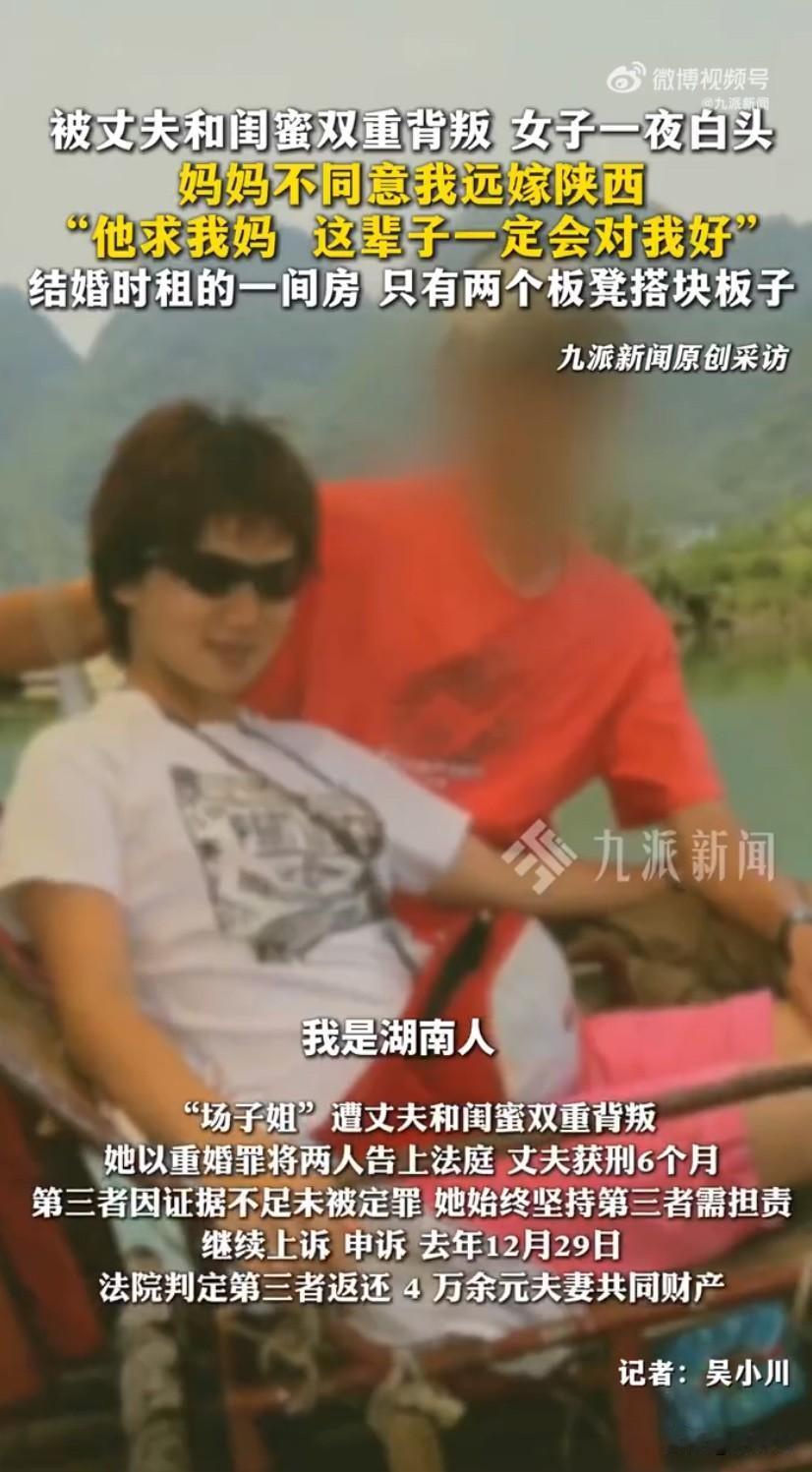 远嫁女子遭丈夫闺蜜双重背叛,昔日承诺成泡影,维权到底终获部分公道!场子姐的经历真的看哭好多人,从湖南远嫁陕西,当初不顾妈妈反对奔赴的爱情,最后竟落得被丈夫和闺蜜双重背叛的下场,她凭着一股韧劲硬刚维权,总算讨回了几分公道。当初场子姐要远嫁陕西时,妈妈打心底里不同意,毕竟女儿远走他乡,受了委屈连个撑腰的人都没有。那时候丈夫为了娶到她,天天守在她厂门口等,又是送花又是甜言蜜语,还特意求着场子姐的妈妈,拍着胸脯保证这辈子一定会对她好,这番诚意彻底打动了场子姐,她义无反顾地远走他乡,嫁给了这个许诺会护她一生的男人。刚结婚时日子过得特别清贫,俩人就租了一间小房子,连张像样的床都没有,只用两个板凳架块木板凑活,墙上贴个喜字,就算是安了家,可场子姐一点不嫌弃,满心满眼都是和丈夫好好过日子的念头。夫妻俩一起打拼创业,慢慢熬过苦日子,还合伙开了文化传媒公司,丈夫也成了有二十多万粉丝的小网红,日子眼看着越来越红火,场子姐本以为苦尽甘来,却没料到噩梦悄然而至。她出于好心,把离异带娃看着格外不容易的闺蜜拉到公司合作,可她怎么也想不到,自己掏心对待的闺蜜,竟会和丈夫暗生情愫,俩人偷偷走到了一起。后来场子姐在丈夫车里发现了闺蜜的流产资料,才彻底撞破这场龌龊事,她试着劝闺蜜退出,结果反被对方无情拉黑,更过分的是,丈夫和闺蜜后来干脆以夫妻名义公开同居,甚至还逼着儿子喊第三者“妈妈”。这场来自最亲近两个人的双重背叛,直接让场子姐一夜白头,悲痛过后她没有沉沦,而是选择拿起法律武器维权,以重婚罪把丈夫和闺蜜一起告上了法庭。法院审理后认定她丈夫构成重婚罪,判处有期徒刑六个月,可第三者却因证据不足没被定罪。这样的结果场子姐没法接受,她始终觉得破坏别人家庭的第三者必须担责,于是坚持上诉、申诉,从来没放弃讨公道。这场维权路她走得格外艰难,一年就打了13场官司,背后没人撑腰,所有事都得自己扛,可她从没松过劲。终于等到好消息,法院判定第三者必须返还丈夫擅自赠与的四万多元夫妻共同财产,这笔钱不多,却是场子姐维权路上的一大步。当初那句“一辈子对你好”还言犹在耳,如今却成了最讽刺的笑话,场子姐从陪丈夫白手起家的糟糠妻,变成了被抛弃的人,可她没选择忍气吞声,硬是凭着一股韧劲为自己讨公道,这份清醒和果敢,真的太让人佩服。 婚姻背叛维权 闺蜜情崩塌 外嫁女维权 姐妹背叛 来源:九派新闻