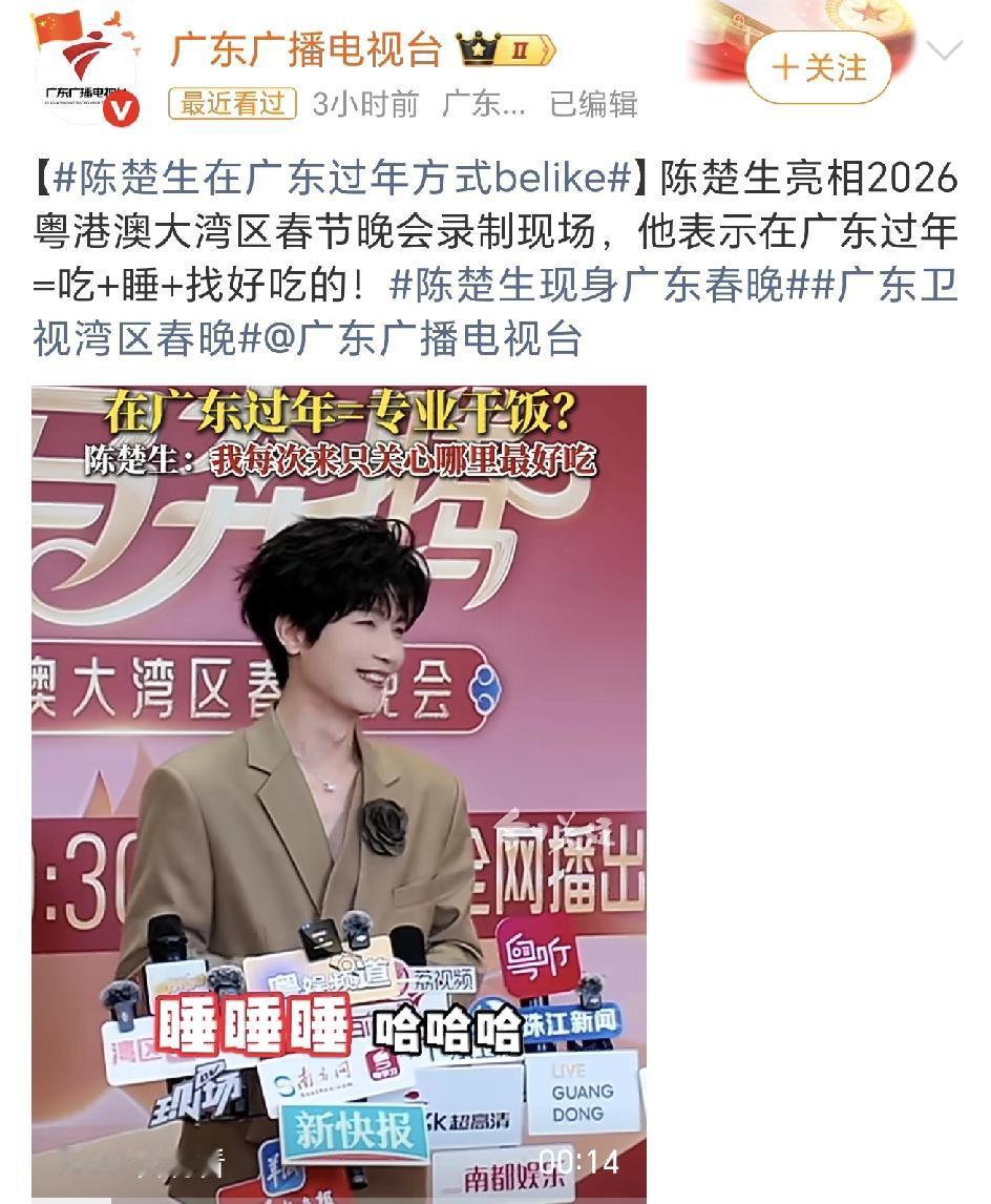 陈楚生四台春晚的播放时间, 广东卫视是腊月二十八,浙江和东方卫视还有央视的百花春晚都是在大年初一。 虽然没有央视的春晚,但是这个春节他也没闲着,连轴转参加四个春晚的录制,好牛[赞]! 看到他四台晚会的行程,粉丝们流传了一句话: 北上广不相信眼泪,相信陈楚生! 浙江网友附和,江浙也相信陈楚生! 真是被脑洞大开的网友们笑死了[笑哭] 这个春节,他是能回家过年了,对他来说可能是更有意义的事。毕竟吃吃吃+睡睡睡谁不喜欢呢[捂脸]! 对于喜欢他的观众来说,可能会有一点意难平,只能期待他的未来会越来越好吧。陈楚生 陈楚生综艺