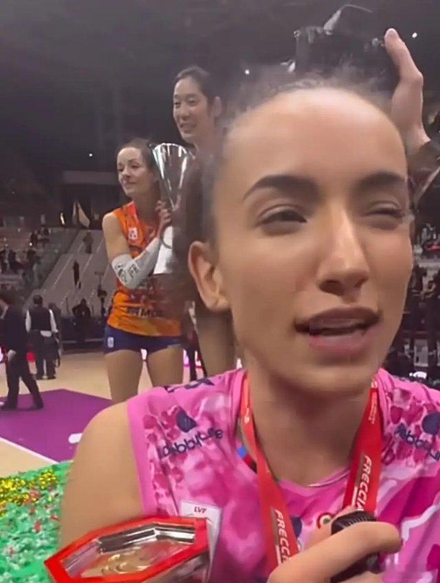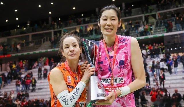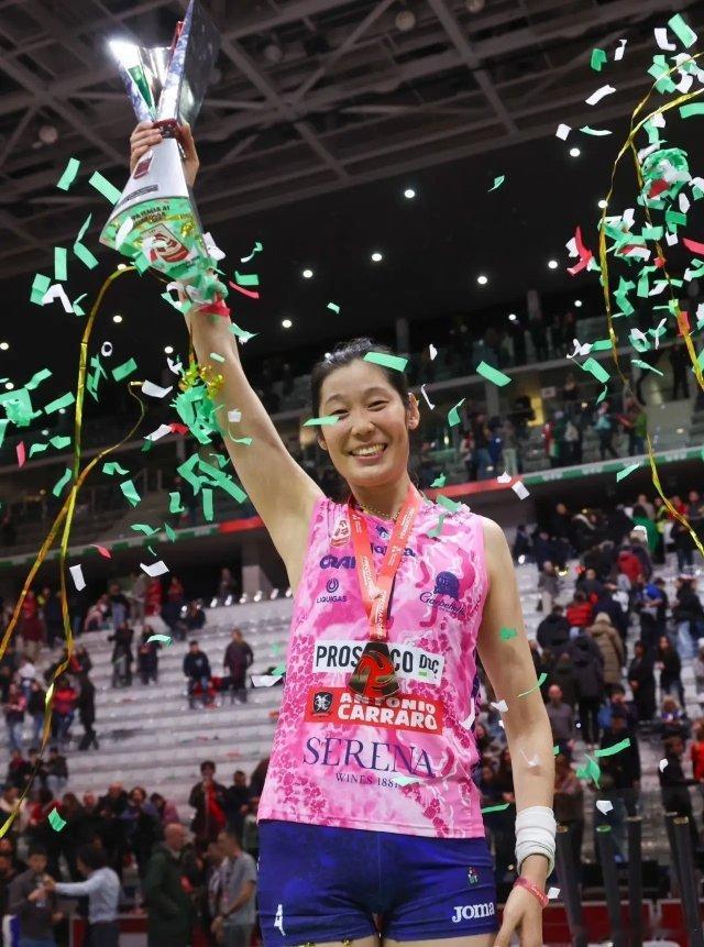暖心一幕!科内利亚诺夺冠后,队员们都在纷纷排照庆祝胜利,轮到朱婷拍单人照片了,德吉纳罗给朱婷抛金丝带,好让朱婷也拍出有氛围感的照片,德吉纳罗真是一位暖心的大姐姐啊,对我们朱婷也是真好,还跟朱婷一起拍合照,优秀的人总是会惺惺相惜的,因为她知道朱婷对科内利亚诺的作用[流泪]德吉纳罗值得这个冠军,朱婷也更值得这个冠军!