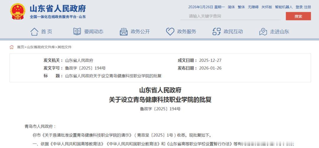 近日,青岛健康科技职业学院的设立获得批复!青岛健康科技职业学院系专科层次高等职业学校,实行省市两级管理、以青岛市为主的管理体制。学院全日制专科在校生规模暂定为12000人。首批设置的高等职业教育专科专业不超过7个。