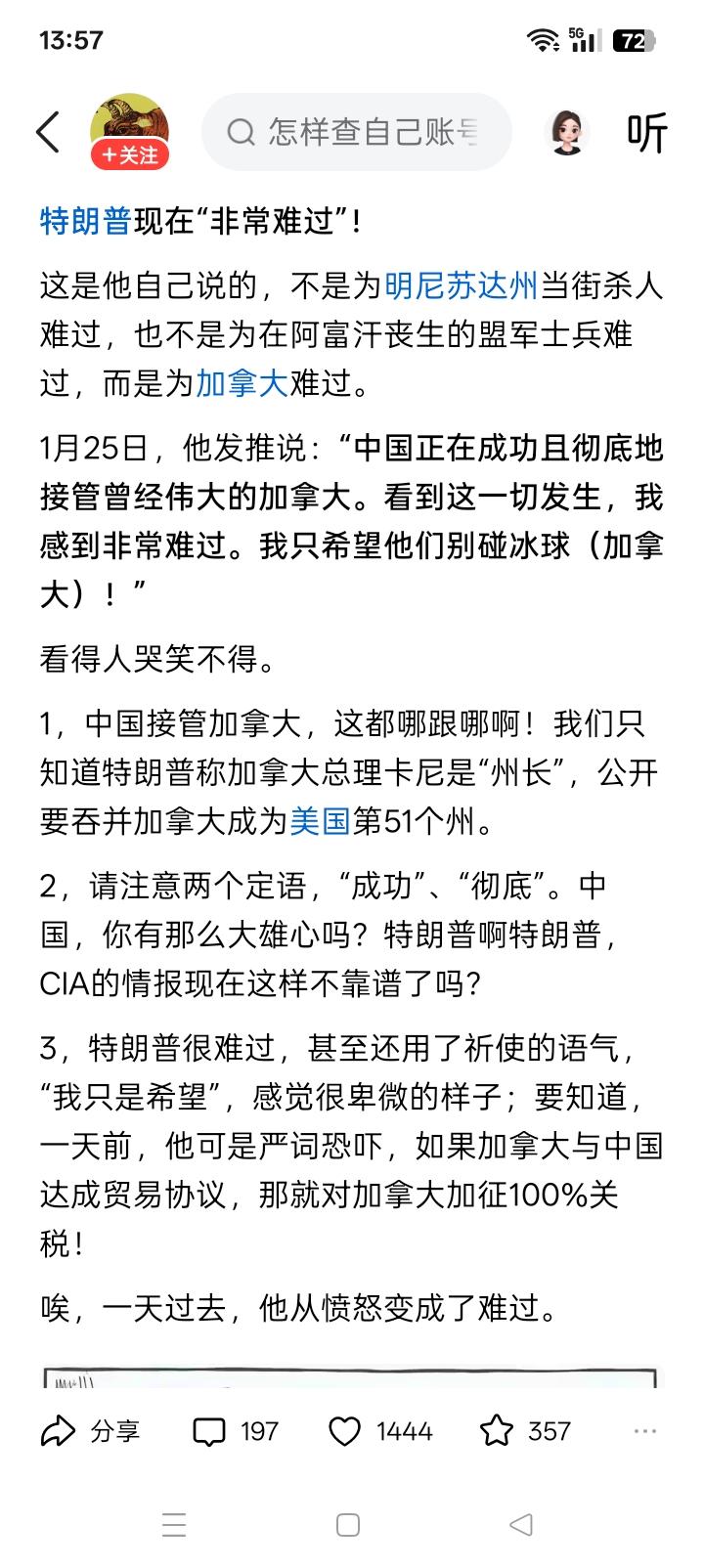 他怎么会“非常难过”? 网络上有消息说,美国总统特朗普似乎说自己“非常难过”,为什么难过?好像就是因为加拿大总理卡尼访问了中囯,并且似乎还取得了很大的成功。 特朗普虽然绞尽脑汁想将加拿大收入囊中,增加为美国的第五十一个州,然而,不仅仅是没有迎来加拿大人的认同,反而引起了加拿大人强烈的不满和愤怒,其总理卡尼访华好像就成了水到渠成的事情。从这件事情上不难看出来,特朗普表现出来的蛮横和强权主义,从总体上来说,注定是要完全、彻底的失败。 为什么现在没有了奴隶社会,因为蛮横和强权不符合人类发展进步的目标,并且与人类文明进步背道而驰。因此,必然是短视和短命的。