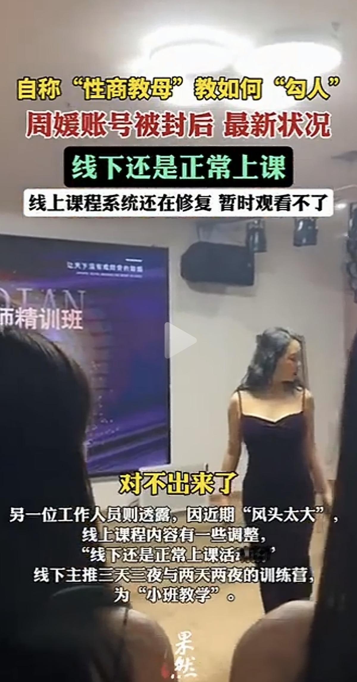 “线上“翻车”线下还能开”?账号被封,但线下还在“小班教学”,这样的话,封号的意义是什么? 既然线上的账号被封,就说明该账号在一定程度上存在违规,例如不良导向,“擦边”等等,那么,线下也应该密切配合,至少要求它停业整顿吧? 就像给一个水池注水,但底下留个阀门放水,啥时候才能水池注满水呢? 这家所谓的“性商学院”线下正在运营的是两天两夜和三天三夜的训练营,是“小班教学”,据说尺度大。 和线上相比,尽管尺度大,但不像线上教学的传播广。 这是线下课程可以继续运营的原因吗? 这样的“教”与“学”不是所谓的“兴趣小组”,几个人凑一起是为了共同的爱好而交流学习,他们是以盈利为目的的,而且具有不良导向。 这样的机构可以大张旗鼓地开张营业吗? 据报道,该培训机构的工作人员称,过了“风头”,线上课程调整之后还会恢复。 教女性怎样勾引男人,这样的培训机构就没有必要存在。 各位觉得呢?