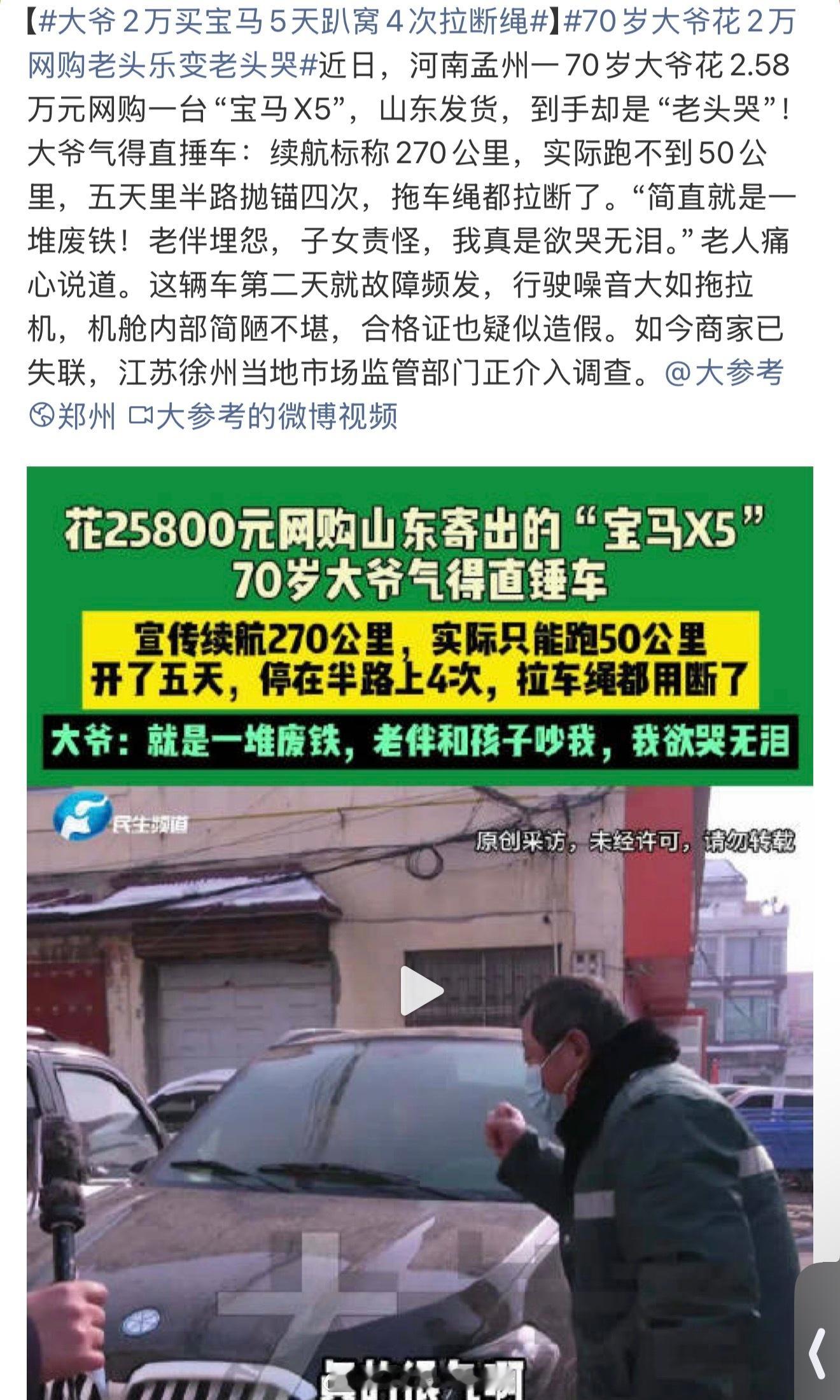 大爷2万买宝马5天趴窝4次拉断绳这是个什么车标?
