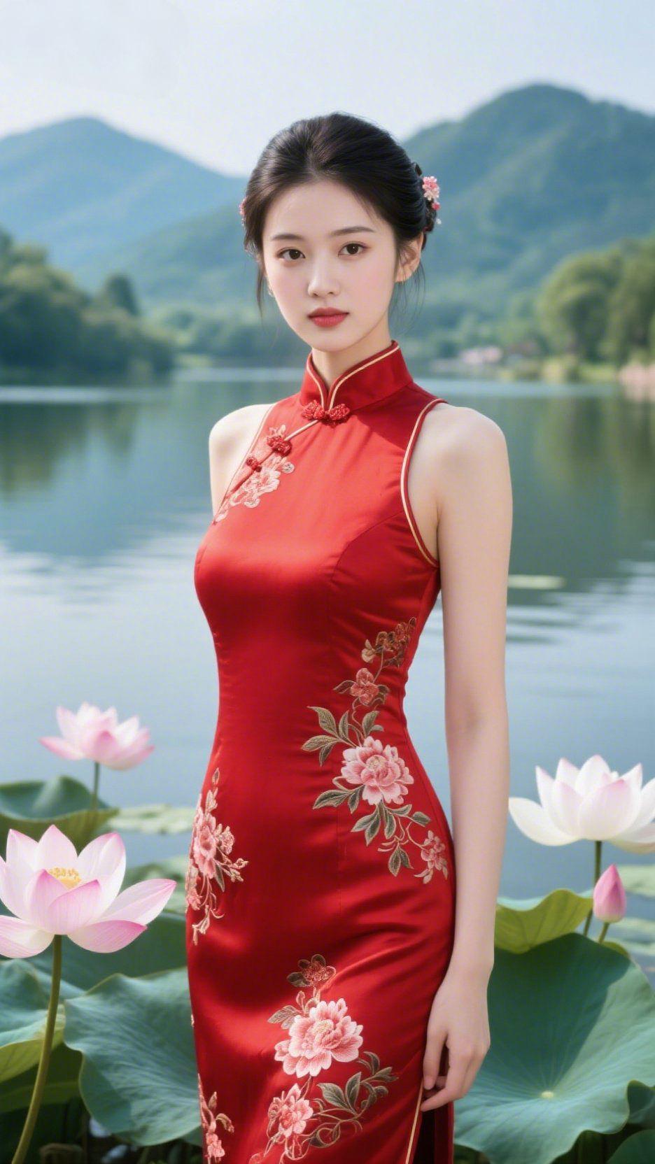 《荷边红衣柔》 湖风裹着荷香漫过岸,远山在水雾里淡成轻浅的轮廓。她立在荷丛旁,红衣如匀开的霞色裁成,绣纹叠着花的软,衬着舒展的肩,却无半分喧闹——发间簪花沾着露,眼底盛着湖的清,指尖轻垂的弧度,轻得像风擦过荷瓣。 云影落进湖面,和裙摆绣纹叠成了不慌不忙的温软。我们总念国风的艳,此刻才觉:是风裹荷香的轻,是眼波载山光的净,是湖岸旁撞进眼底的雅静明亮。像这抹红衣,艳得刚好,柔得恰好,是日常里藏不住的中式清喜。 荷边红衣雅 国风里的静柔
