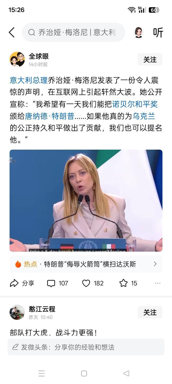 美女加一鞭子? 特朗普很希望得到诺贝尔和平奖。但是去年的诺贝尔和平奖,无论特朗普好像如何强烈的争取,最终也与该奖项擦肩而过。 就在此事似乎已经淡出人们视野的时候,意大利女总理乔治娅·梅洛尼又抛出了一声炸雷。梅洛尼宣称:她希望有一天将诺贝尔和平奖颁给唐纳德·特朗普。但是,她接下来说,如果特朗普真的为乌克兰的公正持久和平做出了贡献,我们也可以提名他。这就是说,梅洛尼提名特朗普获诺贝尔和平奖是有条件的,特朗普必须要为乌克兰的公正持久和平作出贡献。 那么,什么才是公正持久的和平呢?这就似乎因人而异了。估计最主要的就是消除引发战争的根源,俄罗斯此前好像也多次同样提出这方面的要求。但究竟什么才是引发战争的根源,大概各自的观点和立场,就南辕北辙,牛头不对马嘴了。