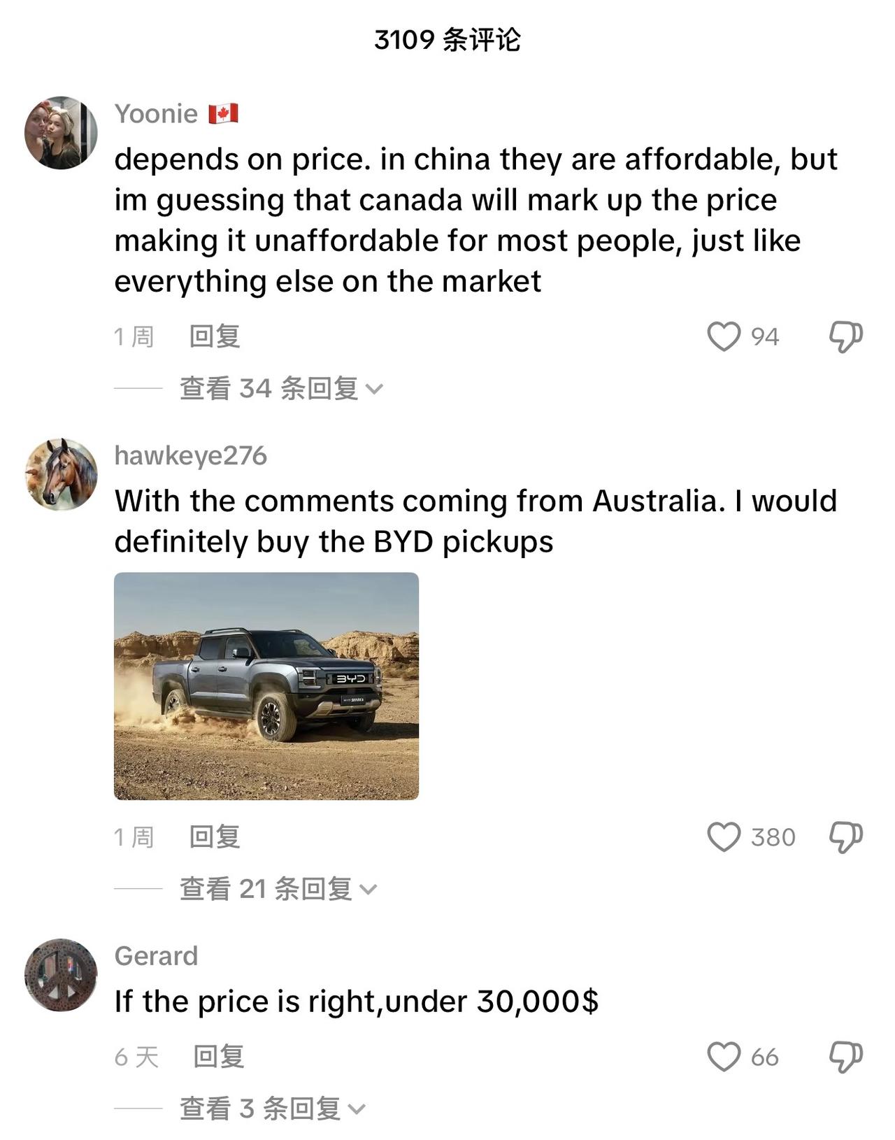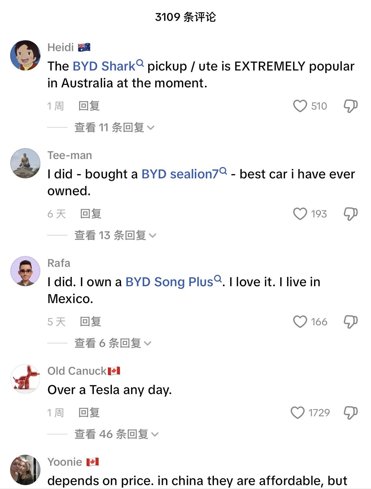 洋抖上有个话题:你会买一辆中国电车吗? 评论区大家的反响都很正面,大部分人买车时的价格敏感度很高。 总得来说就是,很期待物美价廉的中国电车的到来。