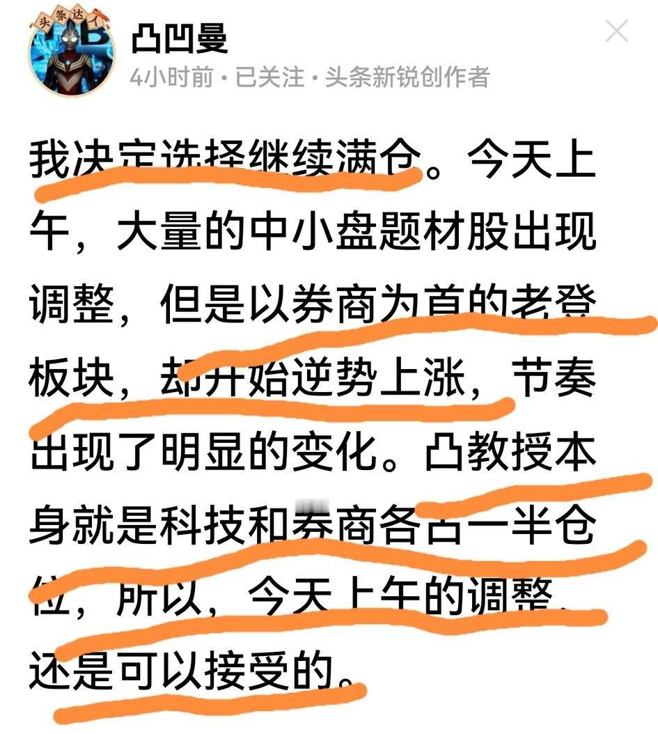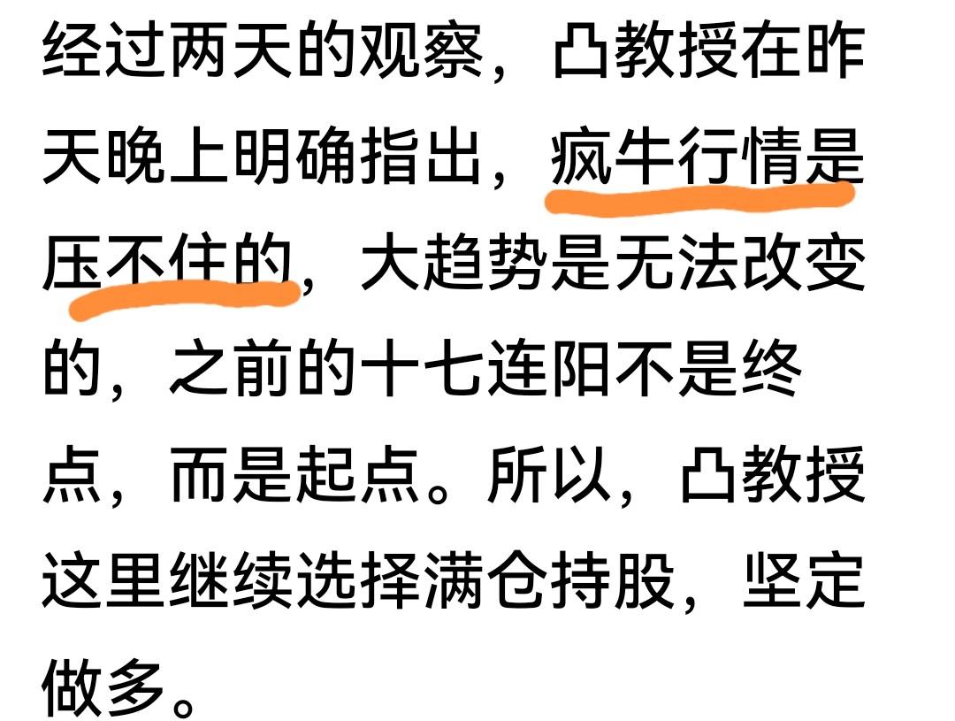 股民基民瞩目的券商股收红,让凸教授大喜,骄傲地宣布疯牛压不住,满仓持股继续。 今天券商虽然冲高回落,但仍然涨了0.43%,除5家平盘外,涨跌比是31:13,很对仗的比例,非常有趣。 但更有趣的是老凸三天前发出警告,再不给我涨回轨道去,就拿减持券商股撒气。看来护牛队还是怕凸教授的,今天果然拉权重股发力,虽未完全重回老凸说的“正轨”,但已进入他“可接受”范围,达到在降温的同时又让“老乡别走”的目的。 兄弟们,今天盘面明显有变异,你跟不跟老凸突突突呢?