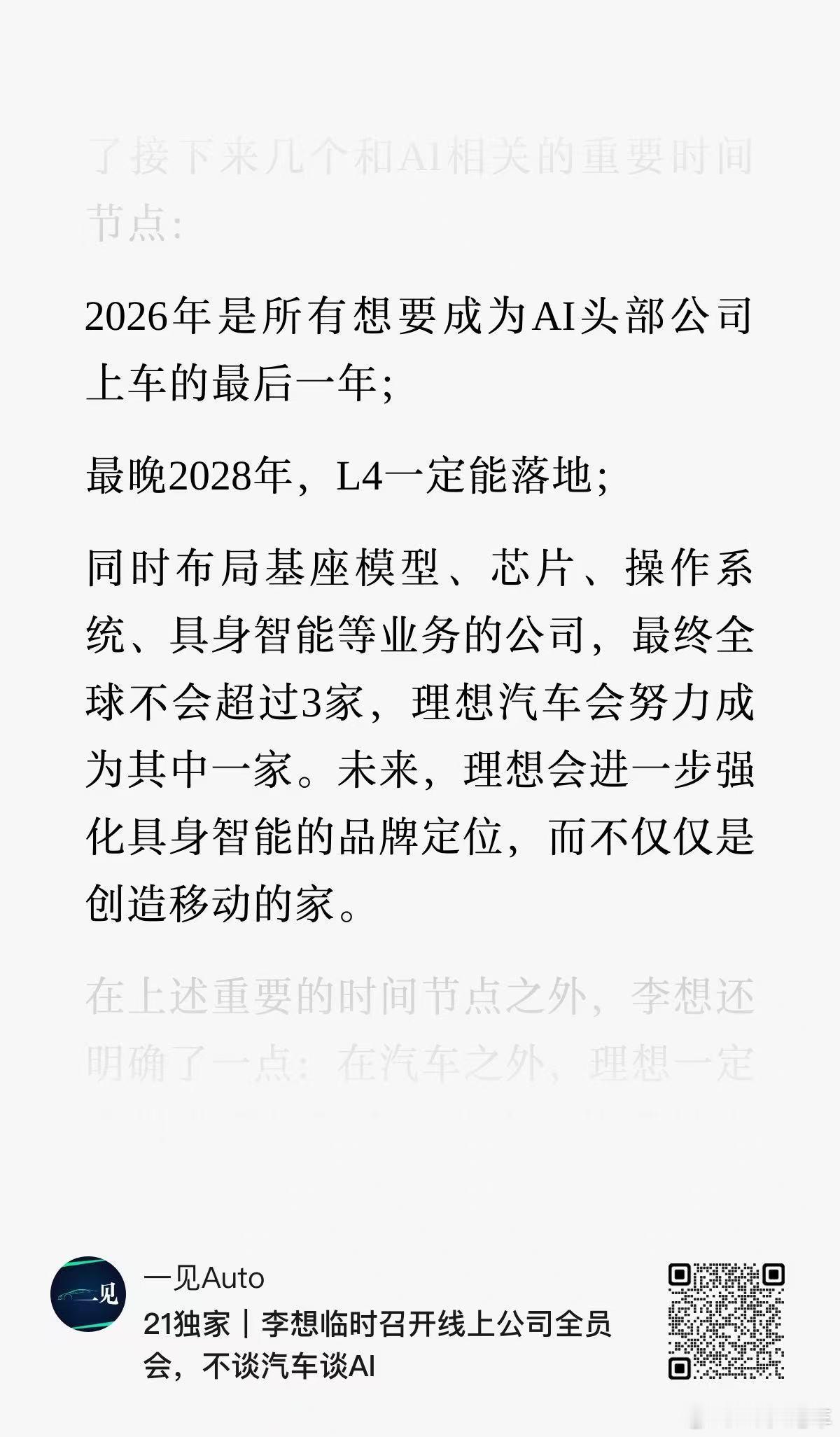 1月26日上午10点半,理想汽车CEO李想召开了一场不一样的线上全员会。近两个小时的全员会议,大部分内容都是李想分享自己对于AI的趋势判断,明确了三点:1、理想一定会做人形机器人,并会尽快落地。而且会招聘更多优秀的人才来搞ai。(想哥对公司内部这批做ai的校招生很满意,觉得去年一年公司在ai方面取得的成果,校招生贡献很大。)2、最晚到2028年,L4一定会落地。(L4,理想也在搞。24年雁栖湖秋季战略会,王兴就是让想哥搞L4,但是当时李想更想先把ai眼镜推进落地。)3、把基座模型、具身智能、芯片、操作系统等一起做的公司,未来全球活下来的公司不超过3家,理想会成为其中一个。4、未来,理想会进一步强化具身智能的品牌定位,而不仅仅是创造移动的家。我也没有拿到更多的内容,因为这个会议很临时,大家都不知道今天要开会,二是想哥今天分享的大家都“有点听不懂”,员工们觉得现阶段最重要的是给大家聊一聊2026年会怎么出牌或者给大家打气。其他不多说了,有个媒体前辈说得对,现在我们能对理想给予的最大支持就是不公开评价。理想汽车汽场全开