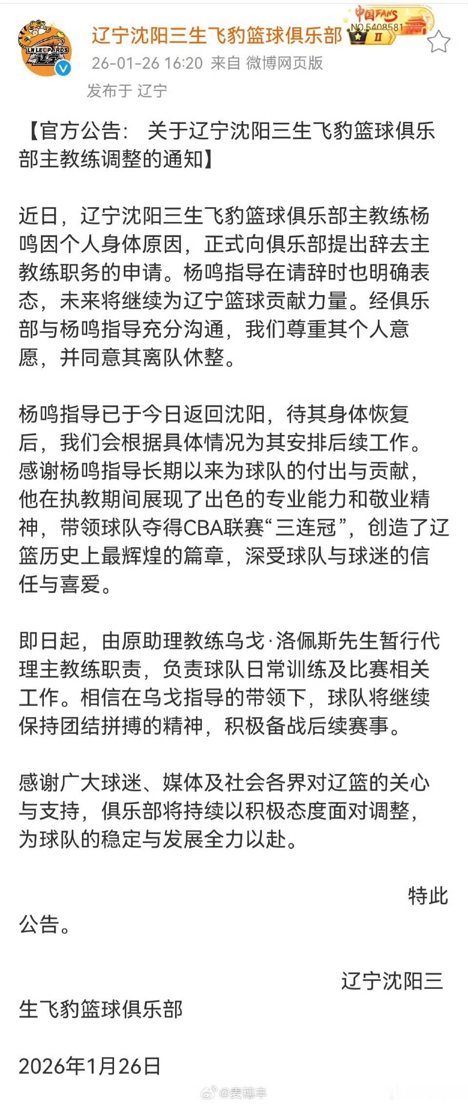 辽宁男篮发布公告,官宣杨鸣辞去球队主帅的职务,助理教练乌戈担任代理主教练。昨晚不敌新疆,第四节单节4分,应该是压死骆驼的最后一根稻草……辽篮应该是要重建了……杨鸣 辞职辽篮官宣杨鸣离队
