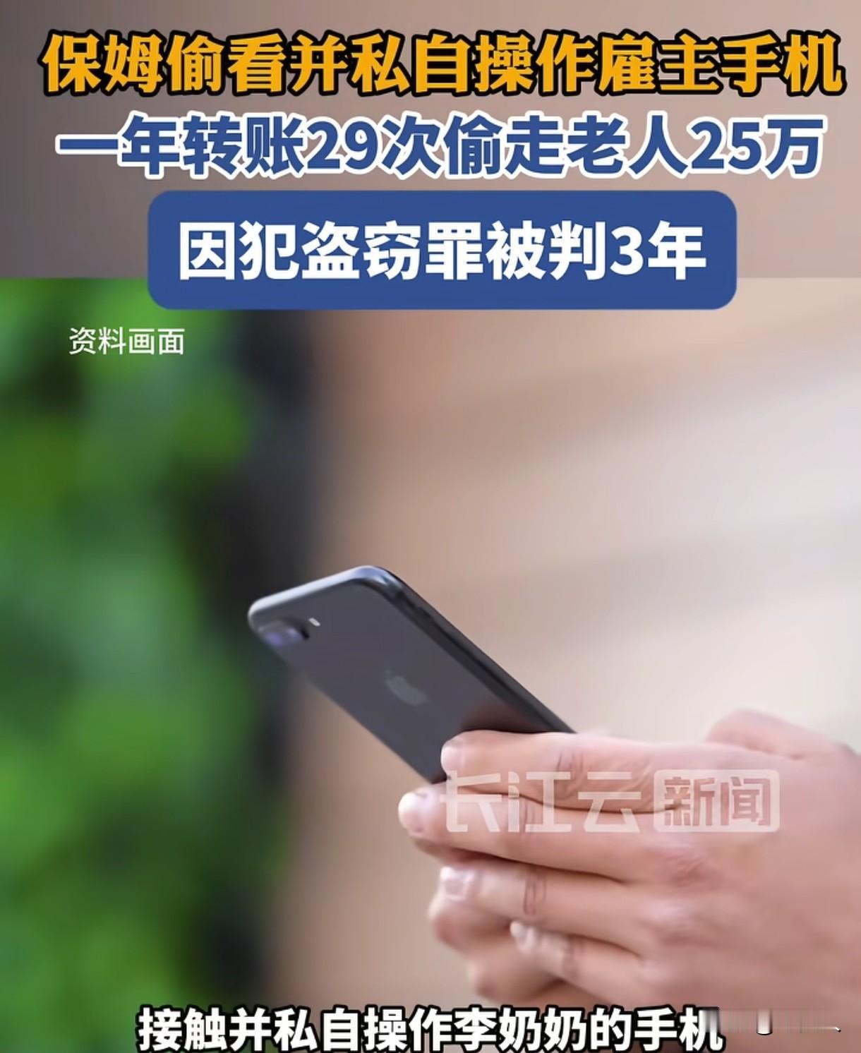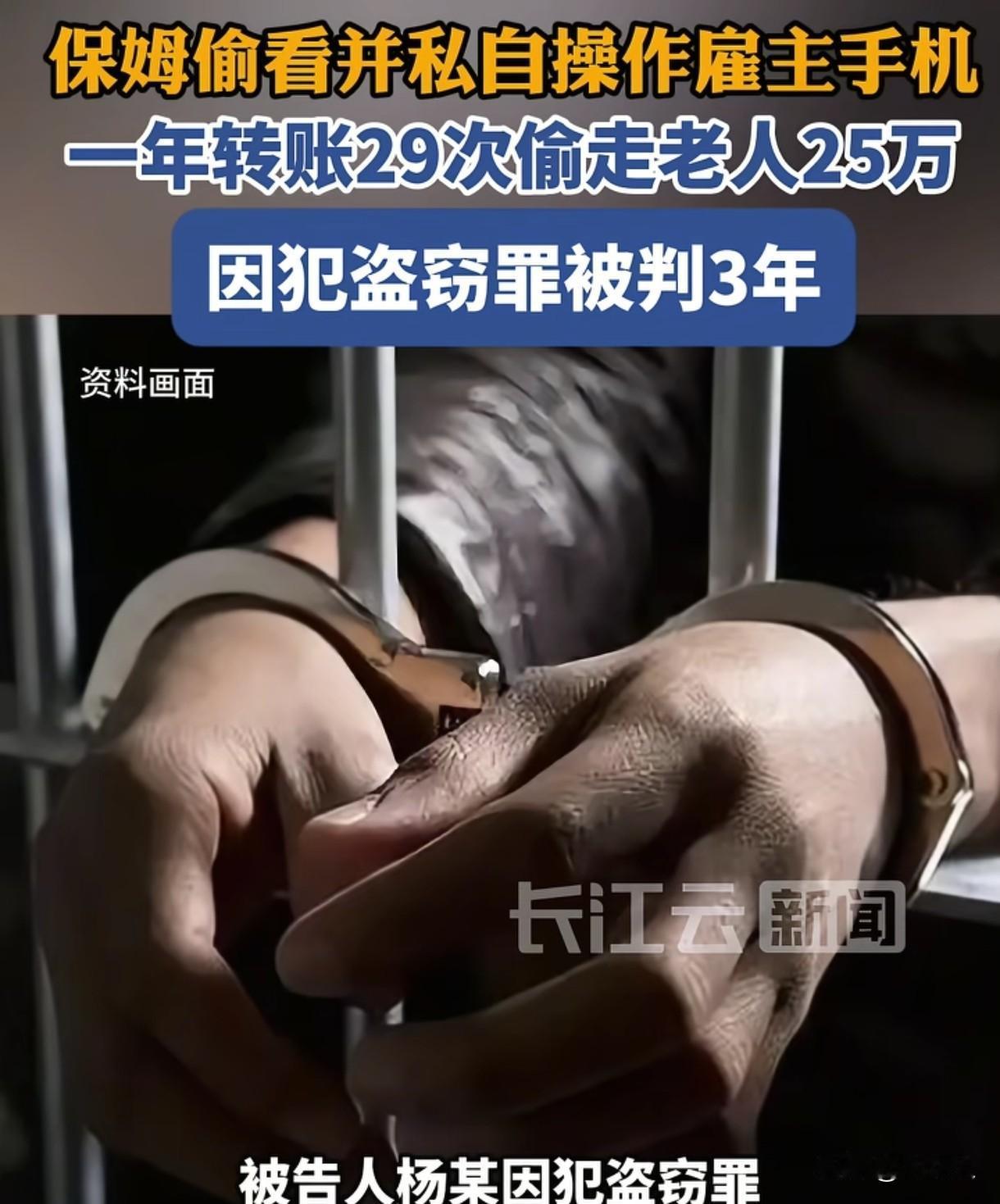“胆大包天!”广东深圳,女子做住家保姆,悄悄记下老人的手机密码和支付密码,短短7个月的时间,转走老人25万积蓄,老人子女发现不对劲后,报了警,女子因盗窃罪获刑3年。网友:真缺德,偷鸡不成蚀把米,这样的保姆活该! 2022年,杨阿姨到李奶奶家做住家保姆,照顾李奶奶的日常起居,李奶奶年事已高,子女工作繁忙,陪伴老人的时间比较少。 杨阿姨刚到李奶奶家时,陪老人聊天、散步,给老人准备可口的饭菜,两人渐渐熟悉起来,李奶奶对杨阿姨也越来越信任。 因为李奶奶年纪比较大,出门也不方便,平时家里需要采购一些生活用品,她会让杨阿姨帮忙垫付一下款项,每个月定期把钱转给杨阿姨。 杨阿姨每次都会很爽快的答应下来,并把购物小票收好,方便李奶奶核对,李奶奶对杨阿姨非常放心,觉得她是一个老实可靠的人,每次都会根据杨阿姨的报账把钱给她。 两人相处2年多后,杨阿姨也摸清了老人的习惯,她看到老人对钱财并不是很细心,每次转账也不会去仔细查看账单,并且有时候老人还会让她帮忙查看网购物品等。 她心里渐渐产生了歪心思:“老人这么有钱,又这么信任我,我悄悄从她账户里转点钱出来,她肯定不会发现的。” 这个念头在杨阿姨脑海中反复闪现,她开始悄悄留意李奶奶的手机,并趁老人不注意,悄悄记下了老人的手机锁屏密码和支付密码。 刚开始她小心翼翼的从老人账户中给自己转了一些钱,然后把记录删掉,提心吊胆的过了几天后,发现老人并未有任何察觉,依旧像往常一样对她信任有加。 她的胆子越来越大,转钱的金额也逐渐增加,从几百元变成了几千元,甚至上万元。 直到2025年3月,李奶奶的家人觉得老人用钱越来越大方,有些不对劲,于是仔细核对了老人的账单,结果把他们吓坏了。 经调查,杨阿姨在2024年8月到2025年3月期间,分29次,将李奶奶的25万余元积蓄转到了她的账户中。 杨阿姨的行为已经构成了盗窃罪。 《刑法》第264条规定:盗窃公私财物,数额巨大或者有其他严重情节的,处三年以上十年以下有期徒刑,并处罚金。 杨阿姨以非法占有为目的,多次盗窃雇主钱款25万元,属于数额巨大的情形,被判处有期徒刑3年,并处罚金。 同时,杨阿姨还需要把盗窃所得的25万余元全部退还给李奶奶。 杨阿姨的行为实在是让人痛心疾首,李奶奶那么信任她,可她却利用老人的信任,把老人的积蓄盗走,她最终不仅失去了工作,还身陷囹圄,实在让人可悲可叹。 这件事也给我们敲响了警钟,对于老年人来说,他们的防范意识相对较弱,很容易成为不法分子的目标。 家中有老人的,子女可以定期去看望老人,关心他们的生活情况,告诉老人不要把手机随意交给家中的保姆,更不要把手机密码、银行卡密码等告诉他人,提高老人的防范意识。