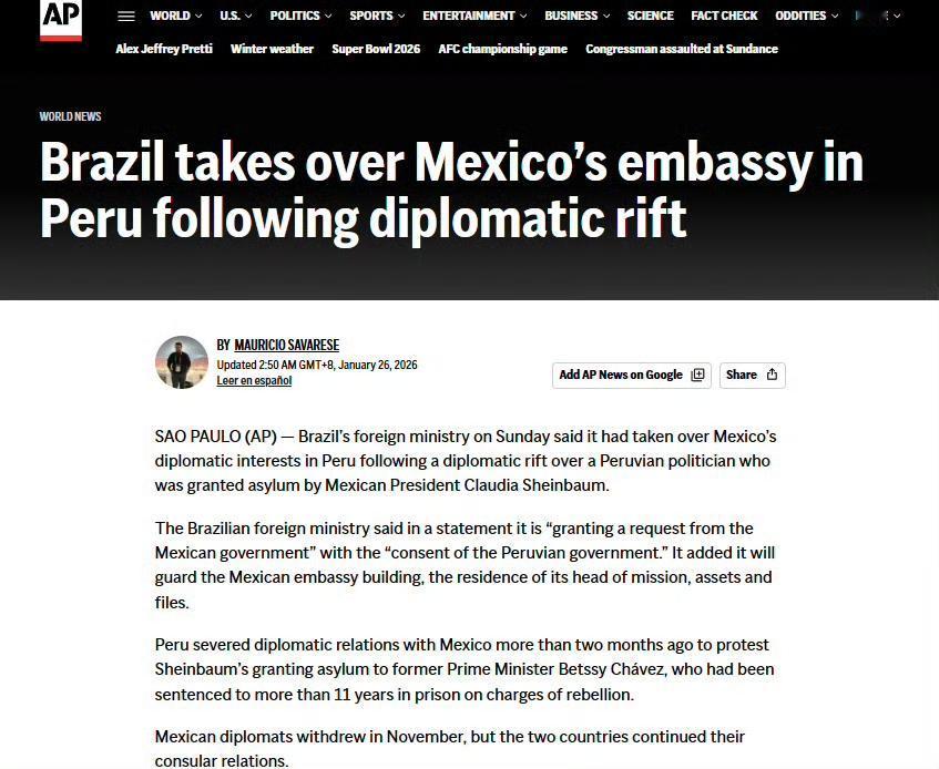 拉美外交风波:秘鲁宣布与墨西哥断交,然后,魔幻的来了:秘鲁把墨西哥驻秘鲁大使馆交给了巴西托管。 秘鲁以叛乱罪判处前总理总理贝齐·查韦斯超过11年监禁,这个前总理现在在墨西哥,向墨西哥申请庇护,墨西哥总统克劳迪娅·谢因鲍姆批准了,于是秘鲁宣布与墨西哥断交。 秘鲁和墨西哥搞事情,和巴西什么关系?也许是因为巴西是拉美唯一的葡萄牙语国家,也可能是因为巴西是拉美第一大国。 大使馆托管的意思是,之前墨西哥驻秘鲁大使馆承担的工作,比如给在秘鲁的墨西哥人提供的各种服务,以及给秘鲁人发放赴墨西哥签证,现在都交给巴西驻秘鲁的外交人员统一处理。