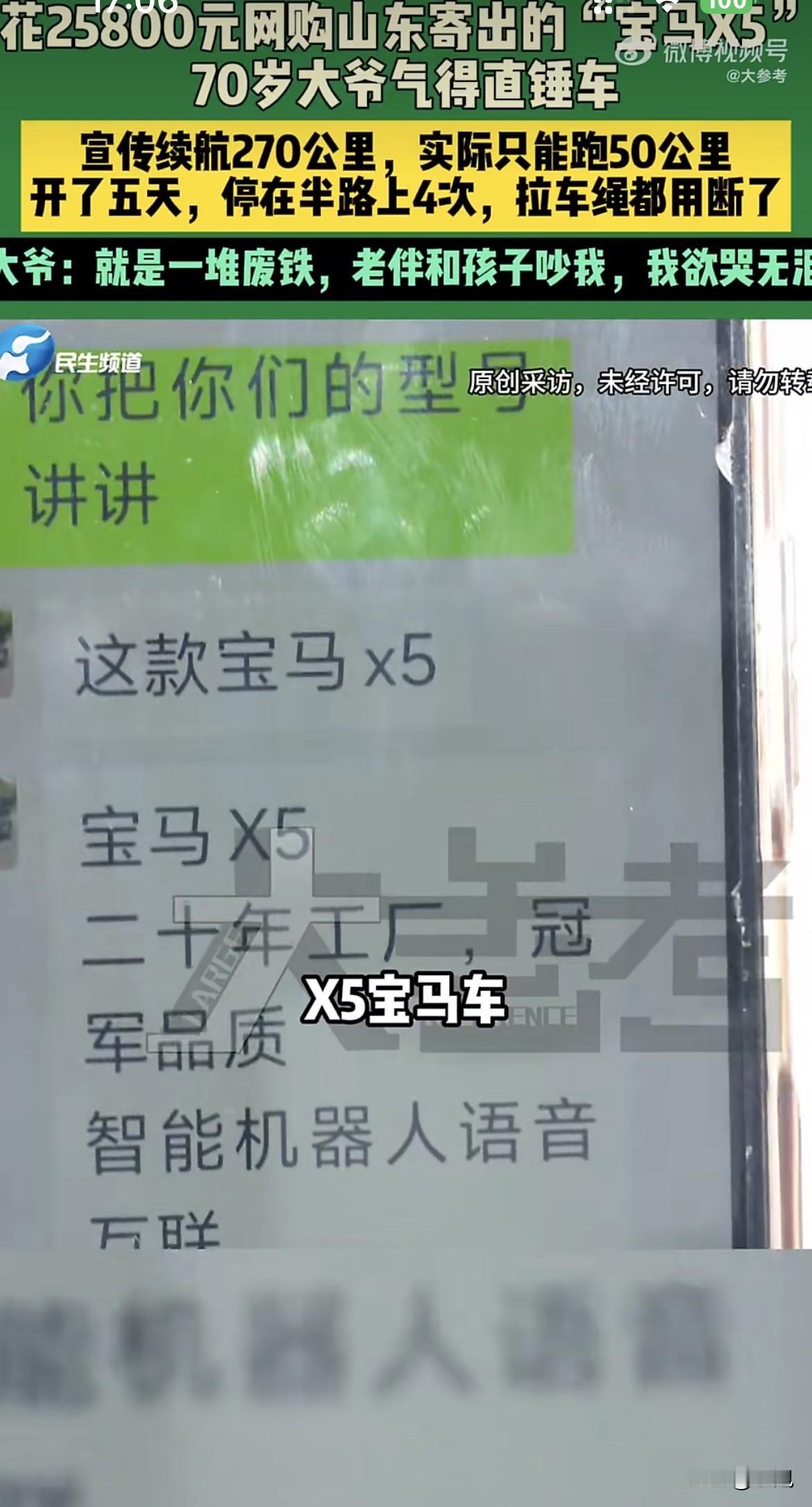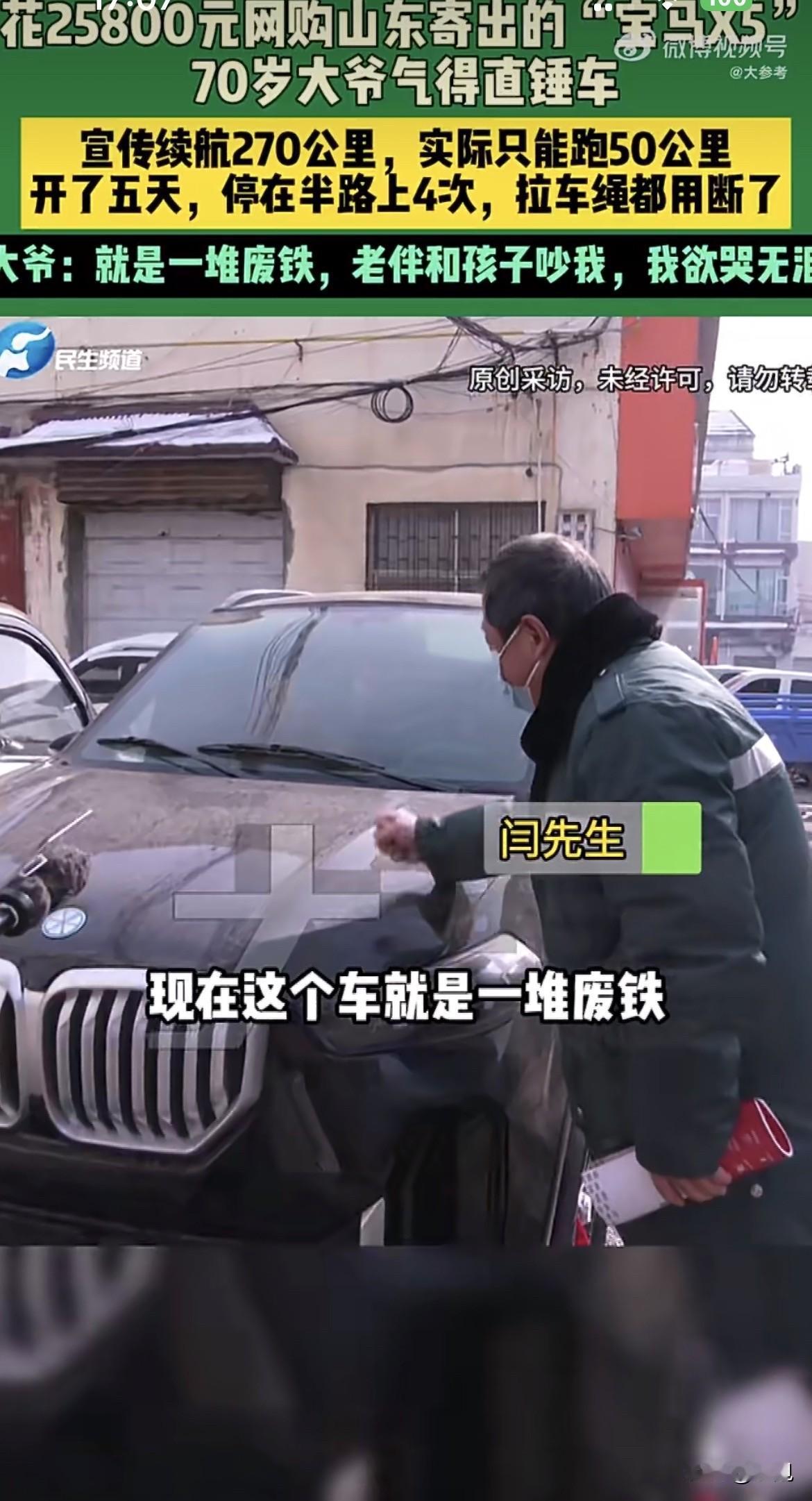 河南一位70岁大爷,花了两年五万八,从网上买了一台“宝马X5”。 车是从山东发来的。大爷心里想,这回可好了,能开着“宝马”出门了。可这高兴劲儿,从打开包装那一刻起,就一点点没了。 说好的能跑270公里。大爷开出去,跑到五十公里不到,车就不动了。头五天,整整在路上抛锚了四次。有一次叫了拖车,拖车绳挂在车上,一使劲,绳子都拉断了,车还在原地没动。 这哪是“宝马”,这就是一堆会跑的废铁。大爷气得用手直捶车。晚上回到家,老伴埋怨他乱花钱,子女也说他糊涂。老人心里憋屈,话都说不出来。 车开起来,那声音就跟拖拉机似的,轰轰响。打开前面机盖看看,里面电线乱七八糟,零件看着就单薄。那张证明车子合格的“合格证”,样子也不太对劲,让人怀疑是假的。 大爷想找卖车的人说理。发现那个网上的店铺已经关了,电话打过去,成了空号。人找不到了。两万五千八百块钱,对于一个农村老人来说,这不是个小数目,说没就没了。 现在,江苏徐州那边的市场监管部门说他们已经知道这事,开始调查了。但人都跑了,这钱能不能追回来,谁也不知道。 这事看起来是个简单的上当受骗,但里头有门道。这种车,在很多地方生产的时候,报备的名字根本不是“汽车”,而是“厂区代步车”。意思是只能在工厂、景区这种封闭地方开,根本不允许开到公共大马路上去。 但卖车的人不会跟你说这个。他们的话术,是专门琢磨过的。先是在直播间里,用特别低的价格,什么“三千块包邮到家”吸引你注意。等你上钩了,私下联系时就说那个特价车抢完了,转而推荐更贵的车型,卖到两三万。 他们会给你看别人转账的记录、发货的视频,让你觉得他们很可靠。最关键的一步,是让你别在正规交易平台付款,而是通过微信、支付宝直接转钱给他们。钱一转,他们就消失了,你想找平台投诉都没门路。 他们敢这么卖,就是摸准了几个心思。很多老人住在乡下,觉得地方偏,交警管不到,可以偷偷开。老人也想要个遮风挡雨的四轮车,但正规的电动汽车太贵,也复杂,这种车看着像名牌,又便宜,正好戳中心思。 更危险的是车本身。这种小作坊拼装出来的车,电池是虚标的,电机是劣质的,车身铁皮薄得像罐头。开着开着突然断电、刹车失灵是常事。新闻里就发生过这种车溜坡差点出大事的情况。它没有经过任何碰撞安全测试,开上路,对自己对别人都是个炸弹。 现在很多地方,比如湖北恩施、内蒙古乌海,已经开始严格整治这种车辆,禁止它们上路,查到要罚款。意味着就算你咬牙把车修好了,也可能根本不能合法开出去。 到最后,老人攒下的钱打了水漂,买回一个全家埋怨、天天堵心的铁疙瘩,还可能面临罚款。骗子的直播账号封一个,他们换一个地方又能重来。 这件事,你怎么看?如果你家老人也想买这种车,你会怎么劝他?