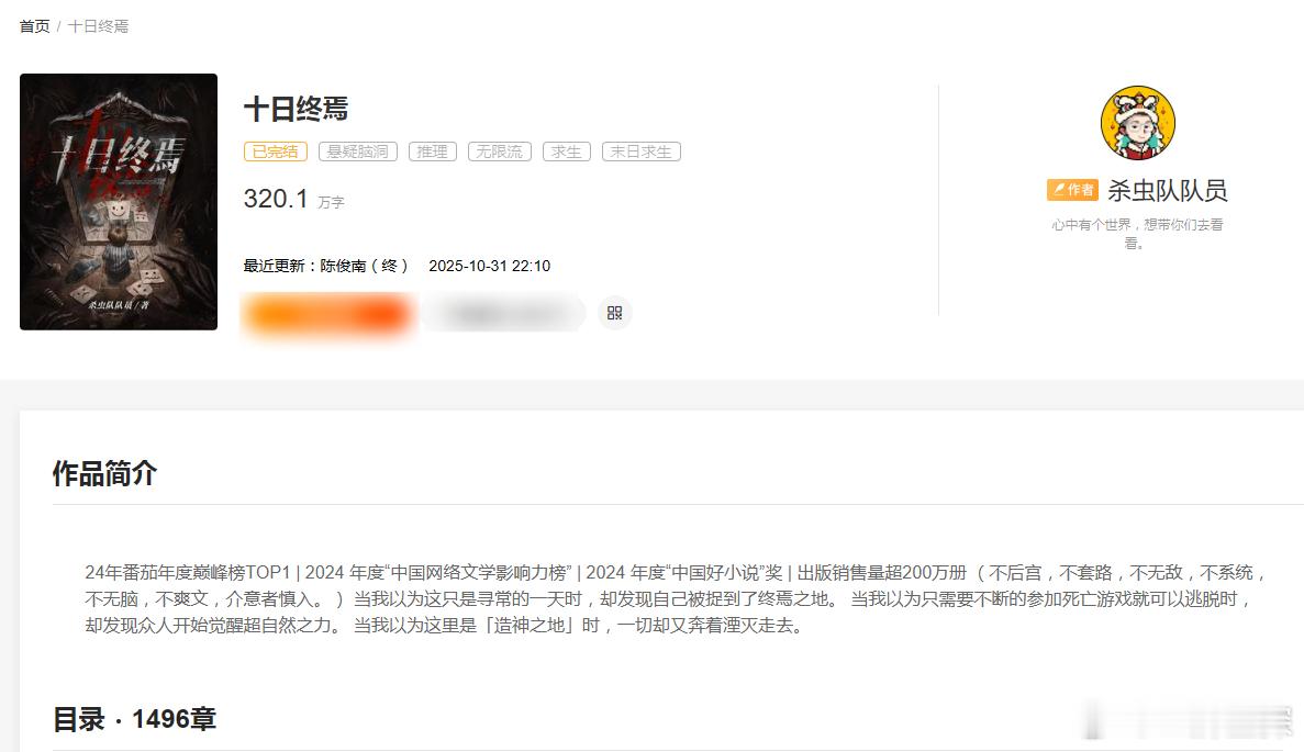 十日终焉改编自番茄小说十日终焉大男主《十日终焉》改编自番茄小说,此本小说24年登番茄年度巅峰榜TOP1,获得2024 年度“中国网络文学影响力榜”和2024 年度“中国好小说”奖,(不后宫,不套路,不无敌,不系统,不无脑,不爽文)这六不太符合我的口味了,坐等官宣