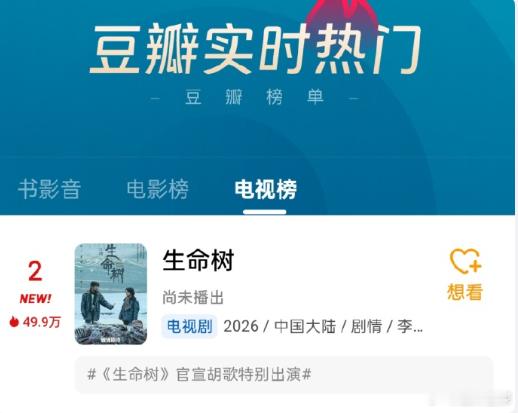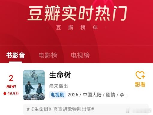 杨紫生命树豆瓣热度生命树豆瓣第二杨紫《生命树》豆瓣热度!!!!还没播就已经开始霸榜实时热门第二了,杨紫白菊号召力就是这么强,期待1月30日和白菊见面啦