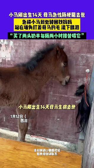 出生仅14天的小马遭遇了揪心的离别:母马因急性肠梗阻去世。 没了妈妈的小马急得到处转圈找妈妈,农场主剪下母马的尾巴毛挂在墙角,小马闻到熟悉的气味后,就守在那盯着母马的毛不肯走,眼眶里还落下了眼泪。 目前农场主买了两头奶羊,每隔两小时轮流喂它,用温柔的照料陪着这只念着妈妈的小马。马哭泣 动物