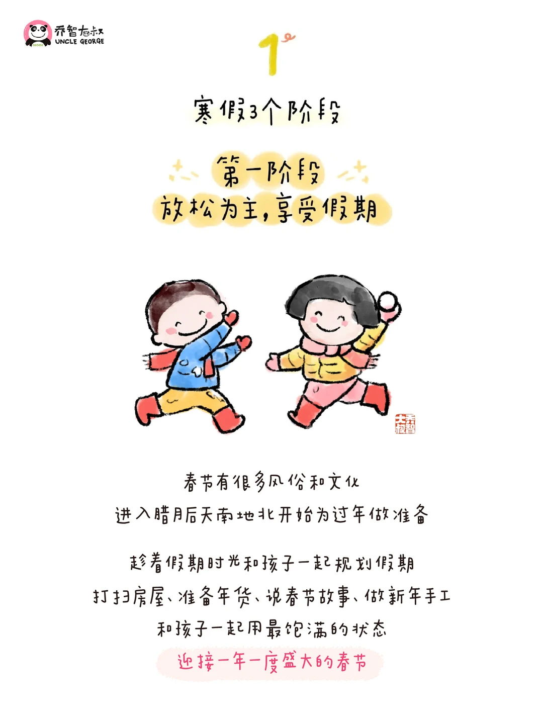 放寒假啦~ 大叔给小朋友们整理了一份 寒假作息时间表 分阶段 + 全流程规划 让孩子自主安排,家长彻底解放双手~ 1️⃣ 分 3 阶段规划,假期不混乱 第一阶段:放松为主,和娃一起备年货、做手工,沉浸式感受年俗氛围; 第二阶段:欢乐过年,借拜年、年夜饭渗透礼仪教育,在年味里悄悄养习惯; 第三阶段:提前收心,逐步调整作息 + 模拟校园节奏,开学不慌不焦虑。 2️⃣ 一日作息表,时间安排超具体⏰ ✅从起床到入睡,每个时段都配了活动 + 亲子互动建议: 👉 8:30 手工 / 游戏、10:30 户外运动、15:00 自由时间… 动静结合不枯燥; 👉 吃饭时帮忙摆碗筷、餐后散步聊天… 顺手培养孩子的生活自理能力。 3️⃣ 细节拉满,带娃更省心 💖每个环节都标注了 “亲子小任务”,不用费脑想活动,跟着做就能兼顾高质量陪伴 + 孩子成长,打印出来贴墙上,娃自己都能对照执行~ 寒假不是用来 “熬” 的 而是让孩子在松弛中成长 家长在陪伴中省心 这才是假期该有的样子呀~