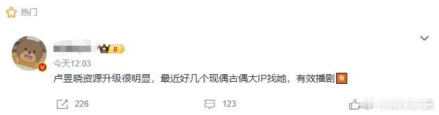 曝好几个现偶古偶大IP找卢昱晓 《轧戏》播出效果还蛮不错的,年初现偶黑马剧,从A播到了S级,主演也都资源升级了,卢昱晓这儿体现的挺明显的,听说现在不少现偶古偶大IP在找她,确实是属于有效播剧