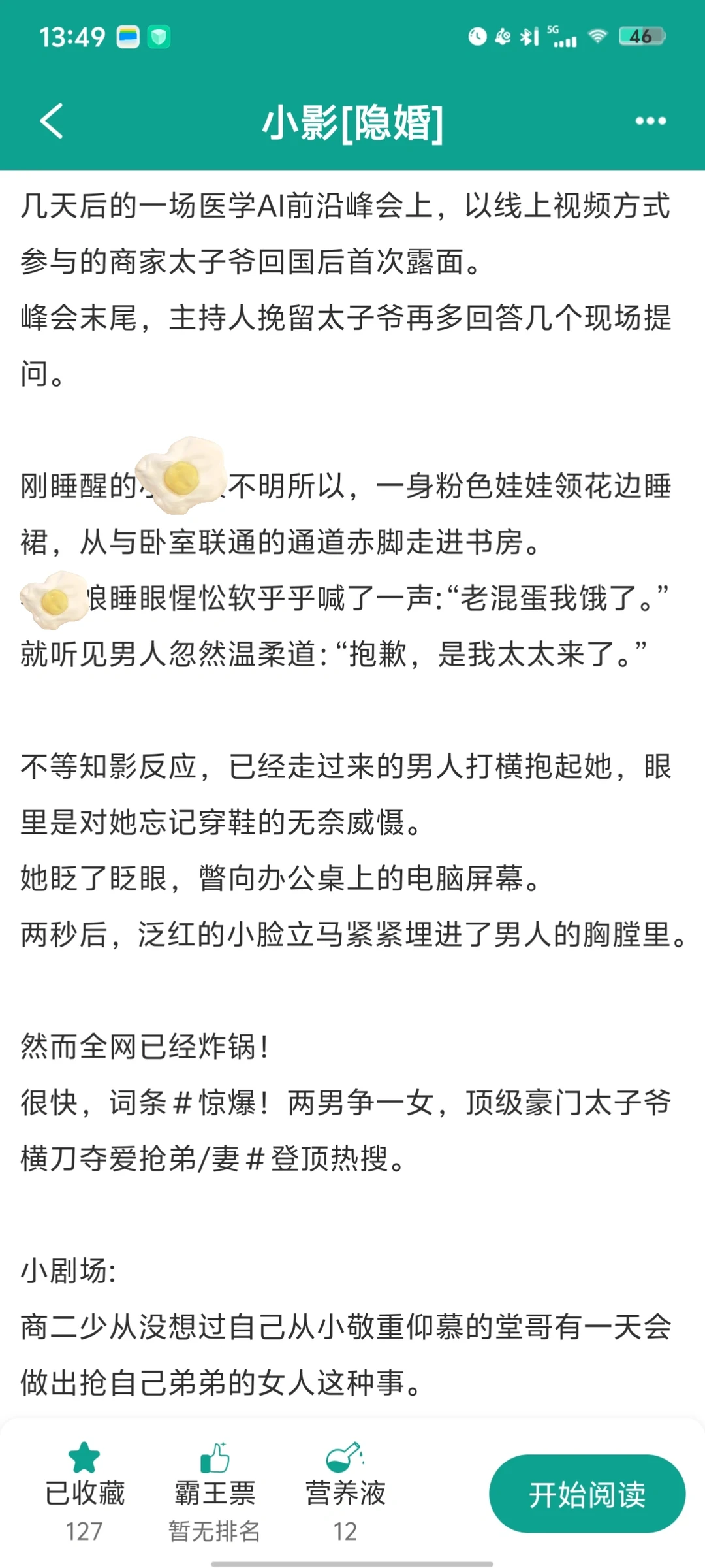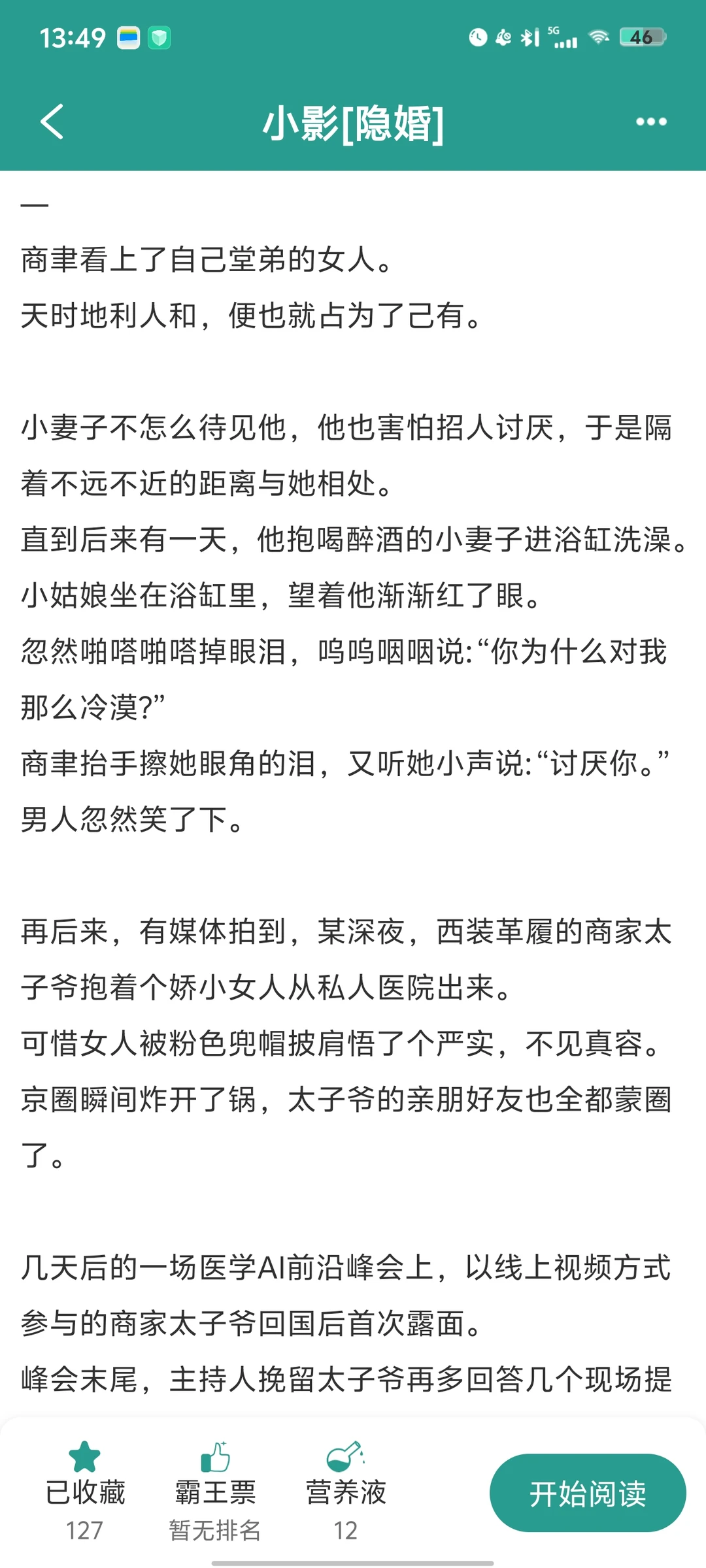 《小影(隐婚)》by喵卜卜 正在连载的小说 [草莓R]男主是外人眼中高台明月般的正人君子,谁都没想到他竟然抢了自己堂弟的女朋友。 尤其堂弟还特别敬重仰慕男主,知道真相后天塌了。 [葡萄R]男主强势,外表温雅贵重成熟,内里却是个动不动就吃醋的老男人。是个超绝引导型恋人。既当爹又当妈,照顾女主无微不至,因为她的开心而开心,因她的进步而自豪。女主是温柔娇气千金,男主内外超绝反差,好看!