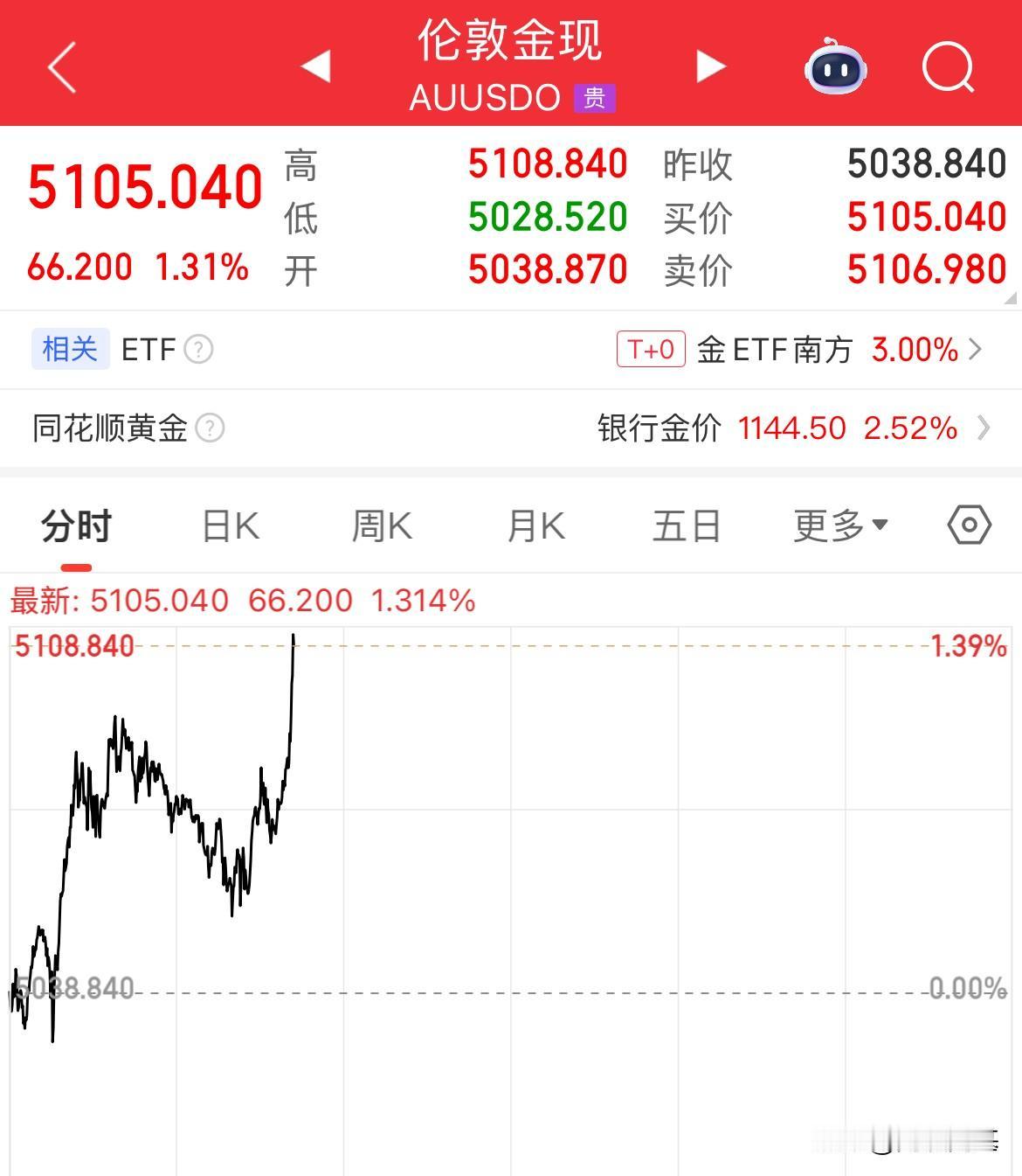 现货黄金突破5100美元/盎司,涨幅1.32%,现货白银突破108美元/盎司,盘中最高109美元/盎司,什么样牛市都比不上贵金属的大牛市啊
