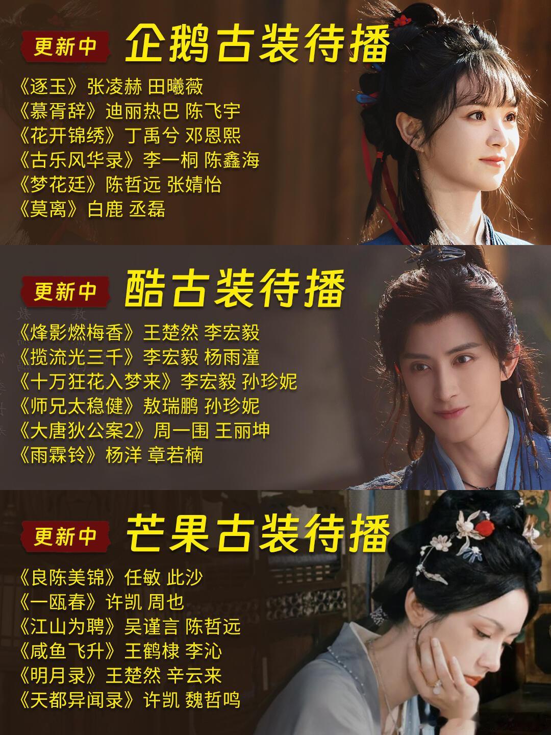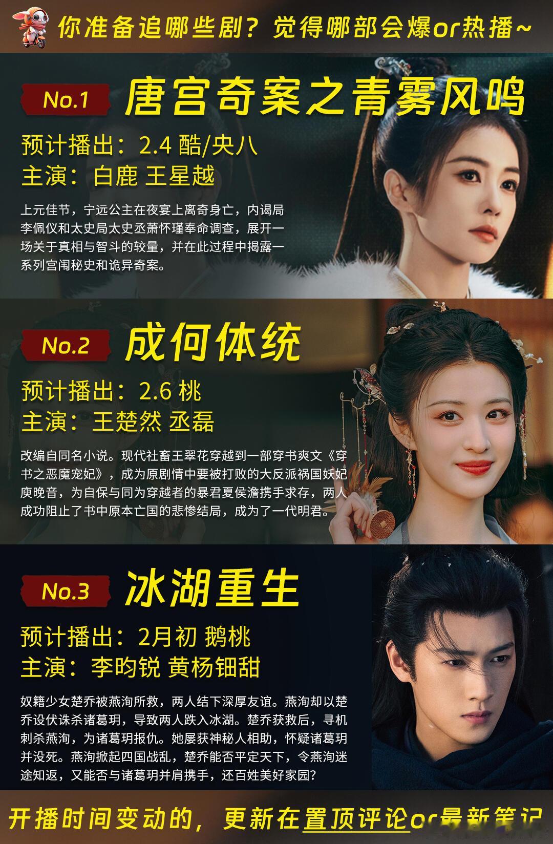 5部「古装剧」2月播,你觉得哪部会爆?「唐宫奇案之青雾风鸣」和「成何体统」是很多追剧党期待已久的剧集,2月上旬前后脚一起来啦,大家准备好追哪部呀?另外,原本以为要殒的女主争议非常大的「冰湖重生」最终也是要播了。逸之兔每月月底更新下个月开播古装剧的播出时间哦,记得查看~🎬已定档or已出网传开播时间的古装剧如下02.04「唐宫奇案之青雾风鸣」白鹿 王星越02.05「成何体统」王楚然 丞磊02.23「江湖夜雨十年灯」周翊然 包上恩🐧🥝👖🥭后续待播古装剧如下🐧《逐玉》张凌赫 田曦薇《慕胥辞》迪丽热巴 陈飞宇《花开锦绣》丁禹兮 邓恩熙《古乐风华录》李一桐 陈鑫海《梦花廷》陈哲远 张婧怡《莫离》白鹿 丞磊🥝《逐玉》张凌赫 田曦薇《祯娘传》杨紫 韩东君《一枕春华》徐若晗 周柯宇《佳偶天成》任嘉伦 王鹤润《明月苍茫》彭小苒 郑业成《云秀行》李一桐 曾舜晞 邓为👖《烽影燃梅香》王楚然 李宏毅《揽流光三千》李宏毅 杨雨潼《十万狂花入梦来》李宏毅 孙珍妮《师兄太稳健》敖瑞鹏 孙珍妮《大唐狄公案2》周一围 王丽坤《雨霖铃》杨洋 章若楠🥭《良陈美锦》任敏 此沙《一瓯春》许凯 周也《江山为聘》吴谨言 陈哲远《咸鱼飞升》王鹤棣 李沁《明月录》王楚然 辛云来《天都异闻录》许凯 魏哲鸣