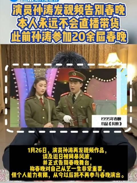 演员孙涛宣布告别春晚:一句“我骄傲”,暖了三十年除夕 当60岁的孙涛红着眼眶说“该让位年轻人了”,那句刻在年味里的“我骄傲”,忽然有了岁月的温度。从1995年《纠察》初登春晚,到2023年《大扫除》悄然收官,这个山东汉子用三十年时光,把军旅正气酿成了市井烟火,陪无数家庭熬过了年夜饭的温馨时光。 总政话剧团的功底,让他的幽默从不含糊。和闫学晶搭档的《吉祥三保》,东北乡音与山东爽朗撞出家常暖意;与秦海璐合作的《你摊上事儿了》,凭耿直台词创下收视高峰。他总挂着憨厚笑脸,把平凡人的欢喜与坚守,藏进一个个小品故事里,让春晚不止有欢笑,更有烟火人间的共情。 近期的网暴谣言与自证清白,藏着舞台老将的委屈。但他坦然转身,说要把舞台让给年轻人,恰如当年赵丽蓉先生的传承。有人曾嫌他笑脸不变,可当真要告别,留在记忆里的,只剩他带来的团圆欢笑。 孙涛的谢幕,是一代人年味记忆的褪色。那些跟着他念“我骄傲”的时光,早已随春晚钟声,变成最朴素的乡愁,温暖了岁岁年年。