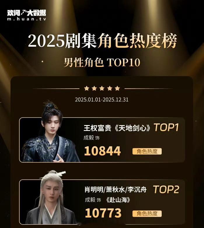 欢网2025剧集角色热度榜成毅三部剧角色全部上榜,前4占3