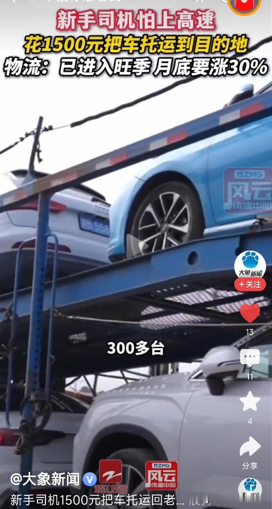 今天刷到个新闻笑死又佩服——浙江杭州一新手司机,怕上高速,直接豪掷1500块把车托运到湖南! 七八百公里啊,自己不开车,让车“坐专车”去!这波操作,我直呼:真是人间清醒! 为啥不自己开?高速上车速快、大车多,新手一紧张容易手抖脚软,万一出点啥事,修车钱够托运十次了! 而且算笔账:自驾油费过路费加起来也得大几百,加上精神损耗,真不如省心托运! 现在物流旺季,月底运费要涨30%,现在不托更待何时?! 说真的,这司机太聪明了! 知道自己技术不够,不硬着头皮上高速添堵,既保护自己安全,又不给路上别人“添麻烦”,这才是真正负责任的好司机啊! 现在科技发达,只有你想不到,没有做不到,连车都能“拼车”跨省游了。 新手朋友们,技术不熟练别硬刚高速,安全永远是第一位! 需要托运的赶紧联系!物流公司旺季涨价,早下单早省钱! 要选正规物流公司,查好评、签合同,别贪小便宜! (文章素材来自大象新闻,侵删)