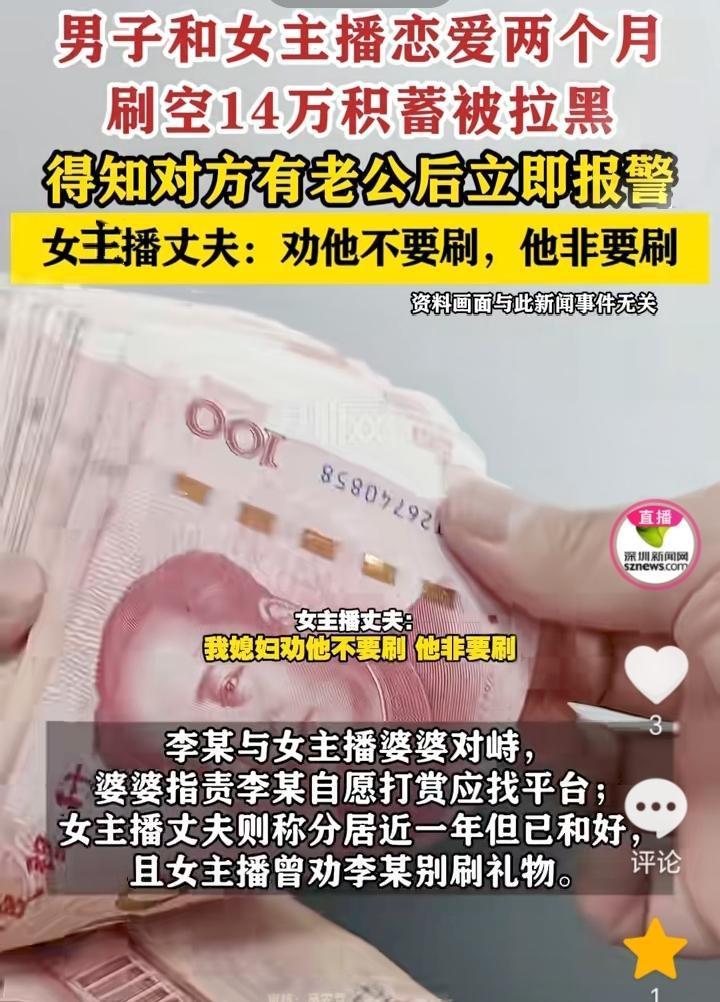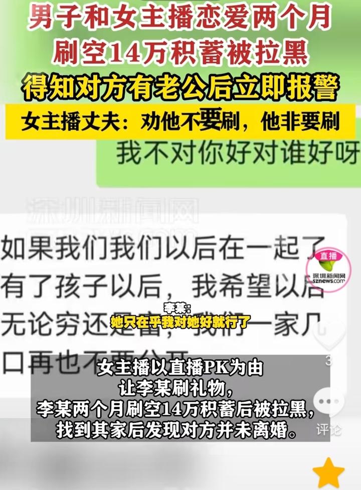 被套路了?河南,46岁单身离异的李某,在网上结识了一名女主播,对方自称单身离异后,双方确认恋爱关系,女主播向李某承诺回老家后奔现结婚,并表示不在乎李某外表,只在乎对她好就行了,此后女主播以PK为由,让李某给刷礼物,李某两个月刷空14万积蓄后被拉黑,李某找到她家后发现她并未离婚,李某和女主播婆婆对峙,婆婆指责李某自愿打赏应该找平台,女主播丈夫称,分居一年但是已经和好,我媳妇不让他刷,他非要刷。目前李某已经报警。 李某可能是被套路了,女主播说的离异单身以及回老家后奔现结婚,不在乎外表,只要对自己好就行,这一系列目的应该就是为了让李某给打赏,结果李某可能也是觉得自己找到了所谓的真爱,所以就轻易相信了女主播的话,两个月刷掉了14万元的积蓄,没钱后女主播就觉得李某没有价值了,所以就拉黑了。 李某现在已经报警,如果他能证明自己是被骗了,那么可能钱还会要回来一部分,如果是自愿打赏,那么可能只能自认倒霉了。 网上交友不能轻信,打赏还是需要理智,作为成年人是要为自己行为负责的。