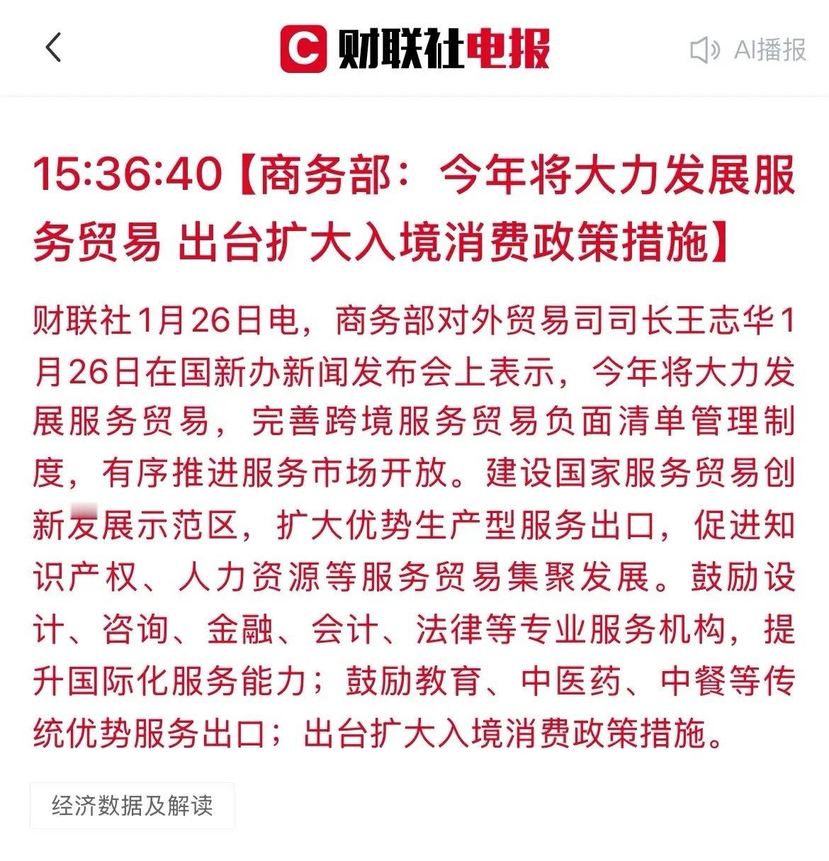 盘后大利好!商务部放大招:大力发展服务贸易,扩大入境消费,这些方向有望直接受益!今天,商务部在新闻发布会上释放明确信号:今年将大力发展服务贸易,出台扩大入境消费政策措施,并点明支持方向。这不仅为相关行业注入强心剂,也为A股市场指明了清晰的投资线索。1. 旅游消费链:“扩大入境消费”政策一旦落地,将直接刺激旅游、购物、交通等消费场景。· 免税店:中国中免、王府井等。· 酒店机场:锦江酒店、上海机场、南方航空、君亭酒店等。· 文旅:曲江文旅、西安旅游、长白山、宋城演艺等。2. 文化“出海”政策直接“点名”要支持中医药、教育、中餐走出去。· 中医药:同仁堂、片仔癀、华润三九等。· 教育:中公教育、凯文教育等。· 中餐:广州酒家、安井食品、全聚德等。3. 专业服务(设计、咨询、金融、法律等)政策鼓励专业服务机构提升国际化能力,具备跨境服务能力的龙头企业将迎来市场扩容。相关个股:中金公司、中信证券、金桥信息、华建集团等。4. 服务贸易平台与支付政策明确建设“国家服务贸易创新发展示范区”,相关区域平台企业将受益于政策红利和资源集聚。相关个股:外服控股、小商品城、拉卡拉、海联金汇、京北方等。此次政策方向明确,旨在提升我国服务贸易竞争力并吸引境外消费。