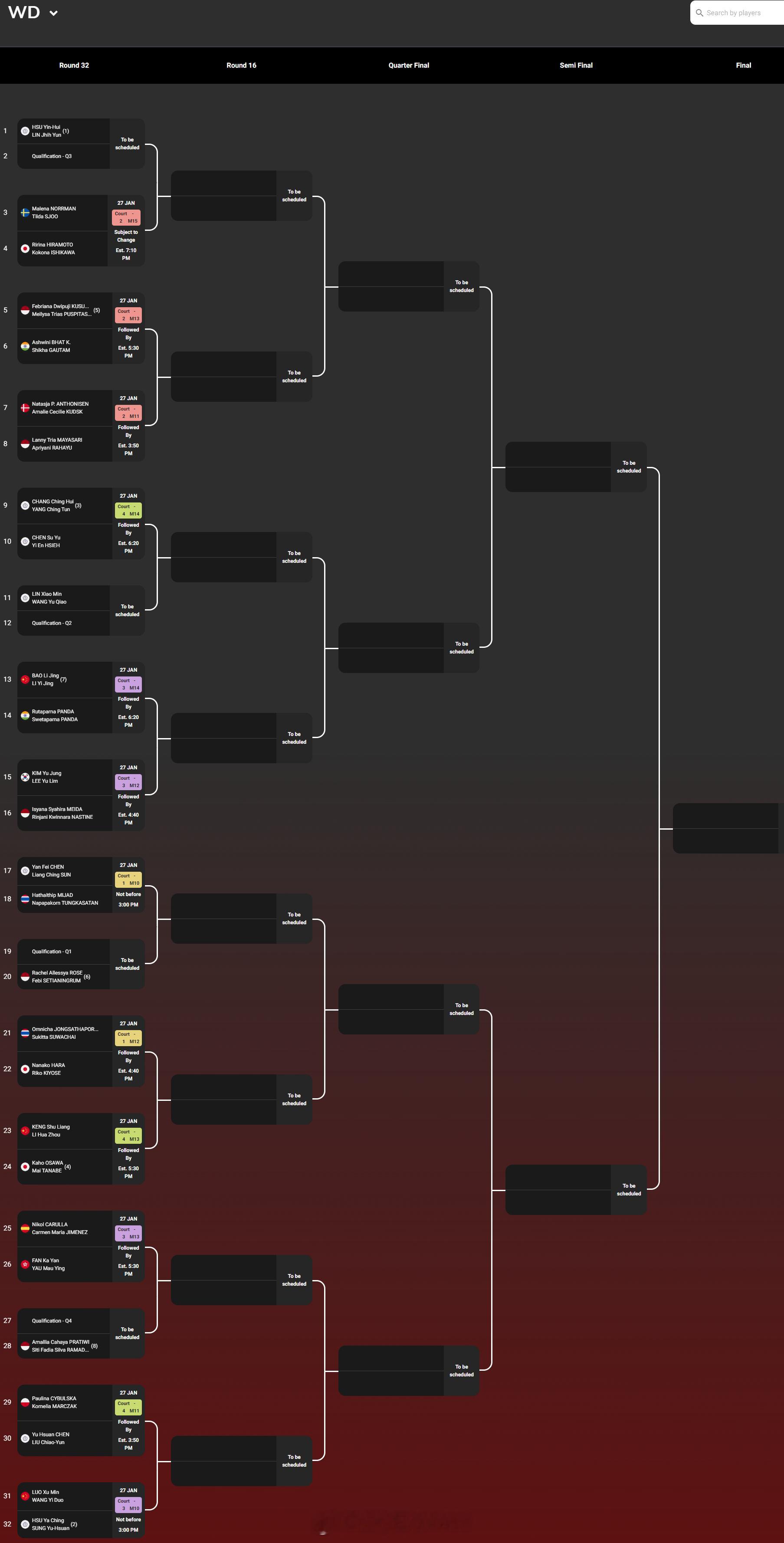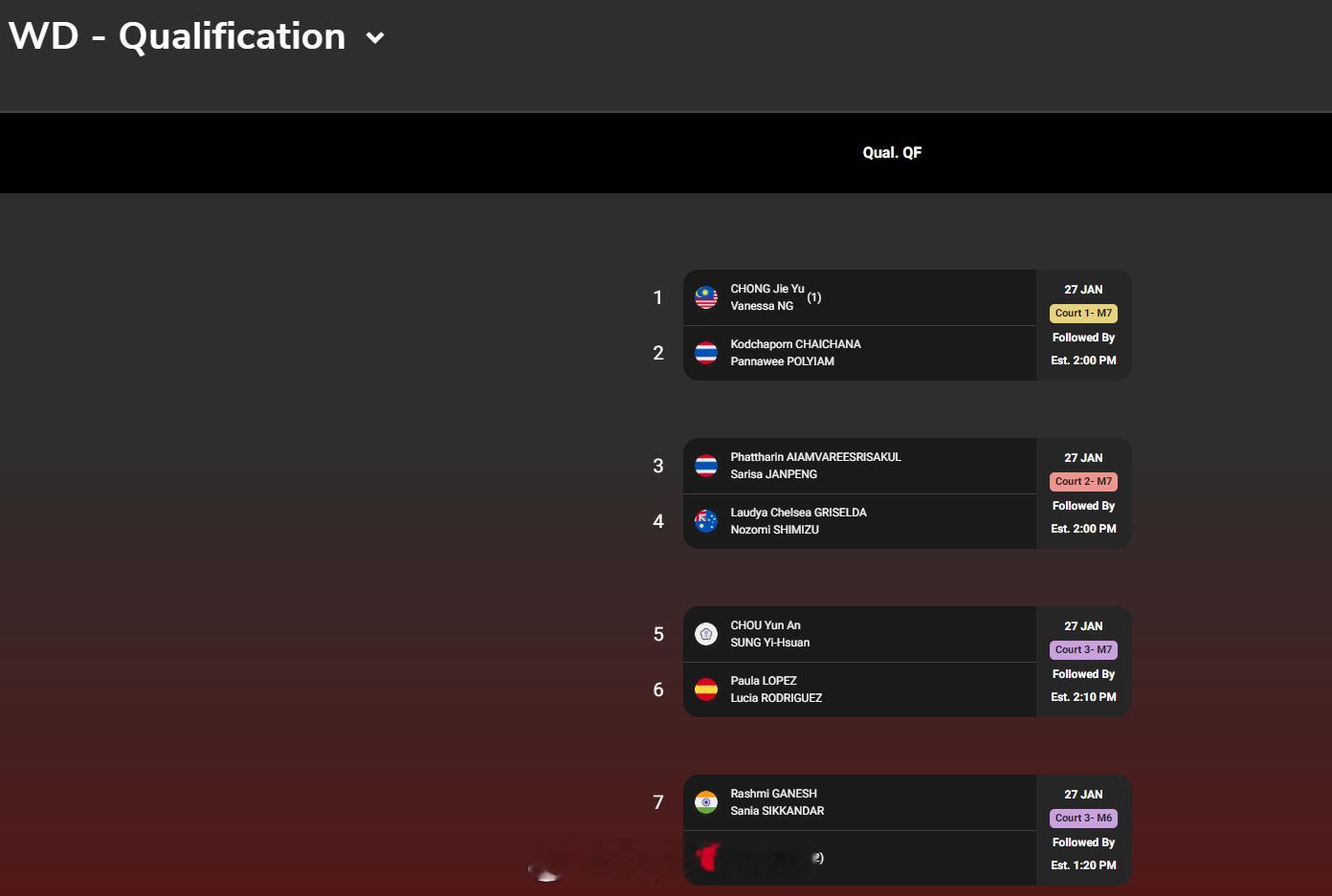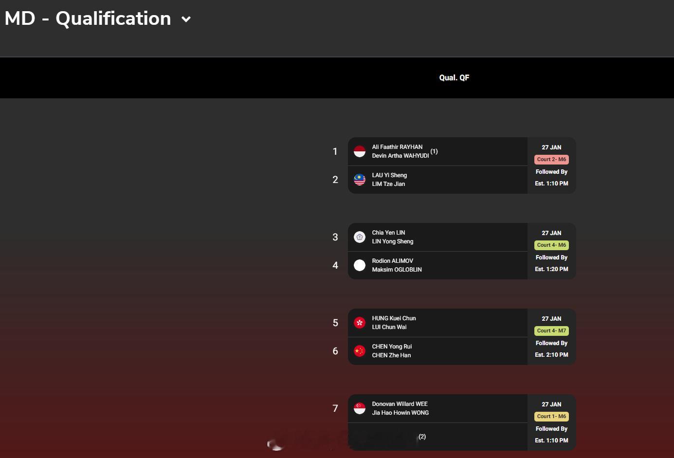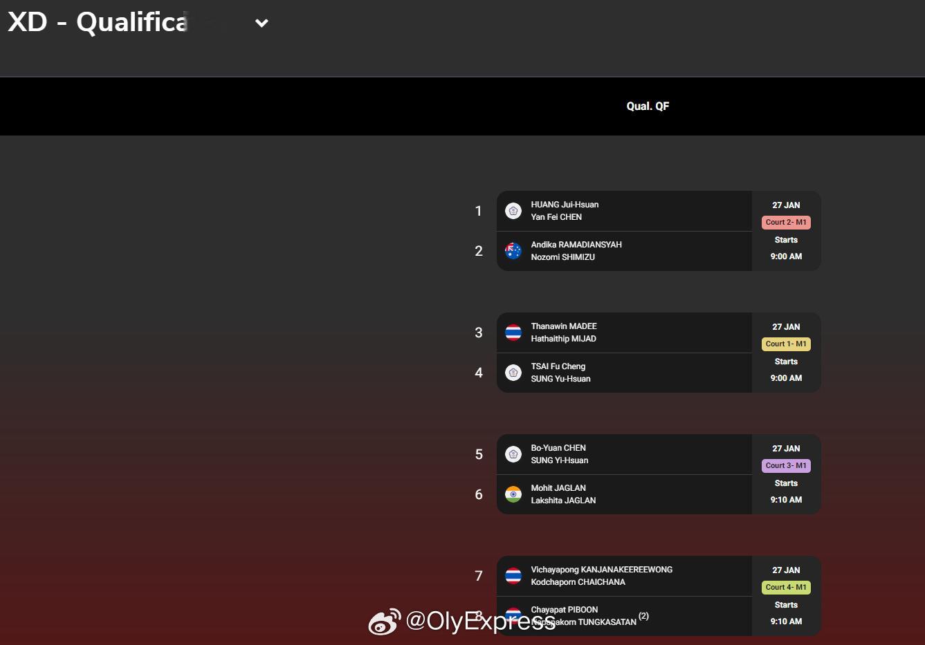 【2026泰国羽毛球大师赛签表】2026年泰国羽毛球大师赛羽联超级赛 1月27-2月1日,总奖金额为25万美元的2026世界羽联超级300泰国大师赛将在曼谷举行,国羽参赛名单如下(Q为资格赛选手),签表见图:男单:胡哲安、朱轩辰(Q)、董天尧(Q)女单:韩千禧男双:陈旭君/刘阳、胡珂源/林祥毅、黄荻/孙文骏、陈永锐/陈喆涵(Q)女双:鲍骊婧/李怡婧、坑姝良/李华洲、罗徐敏/王漪朵混双:程星/张驰、高家炫/吴梦莹、朱一珺/李茜