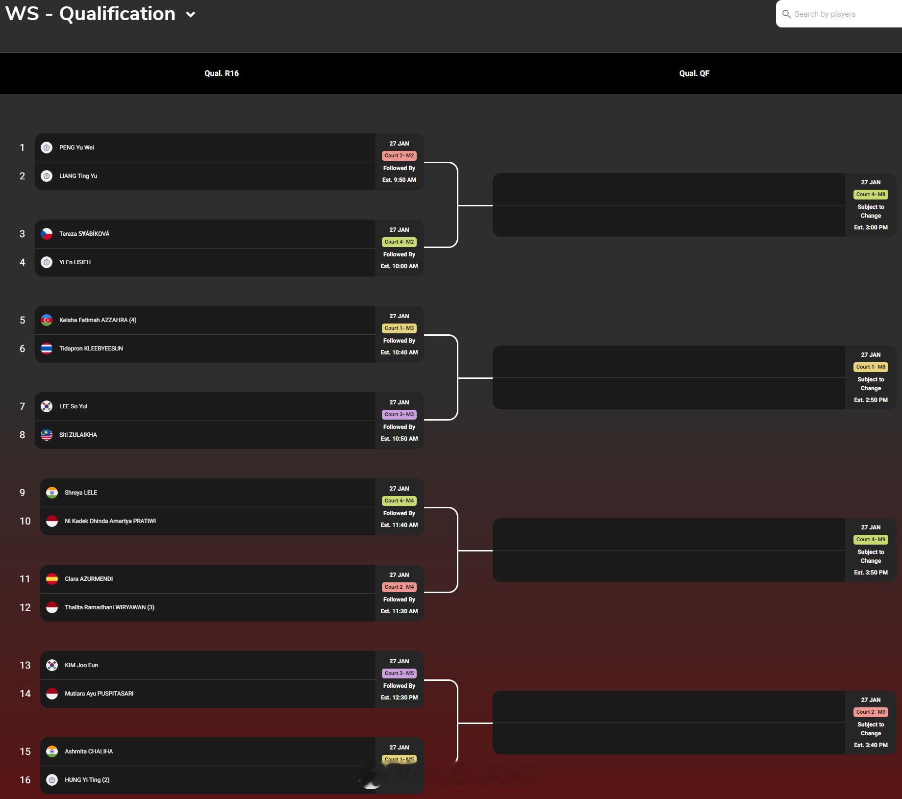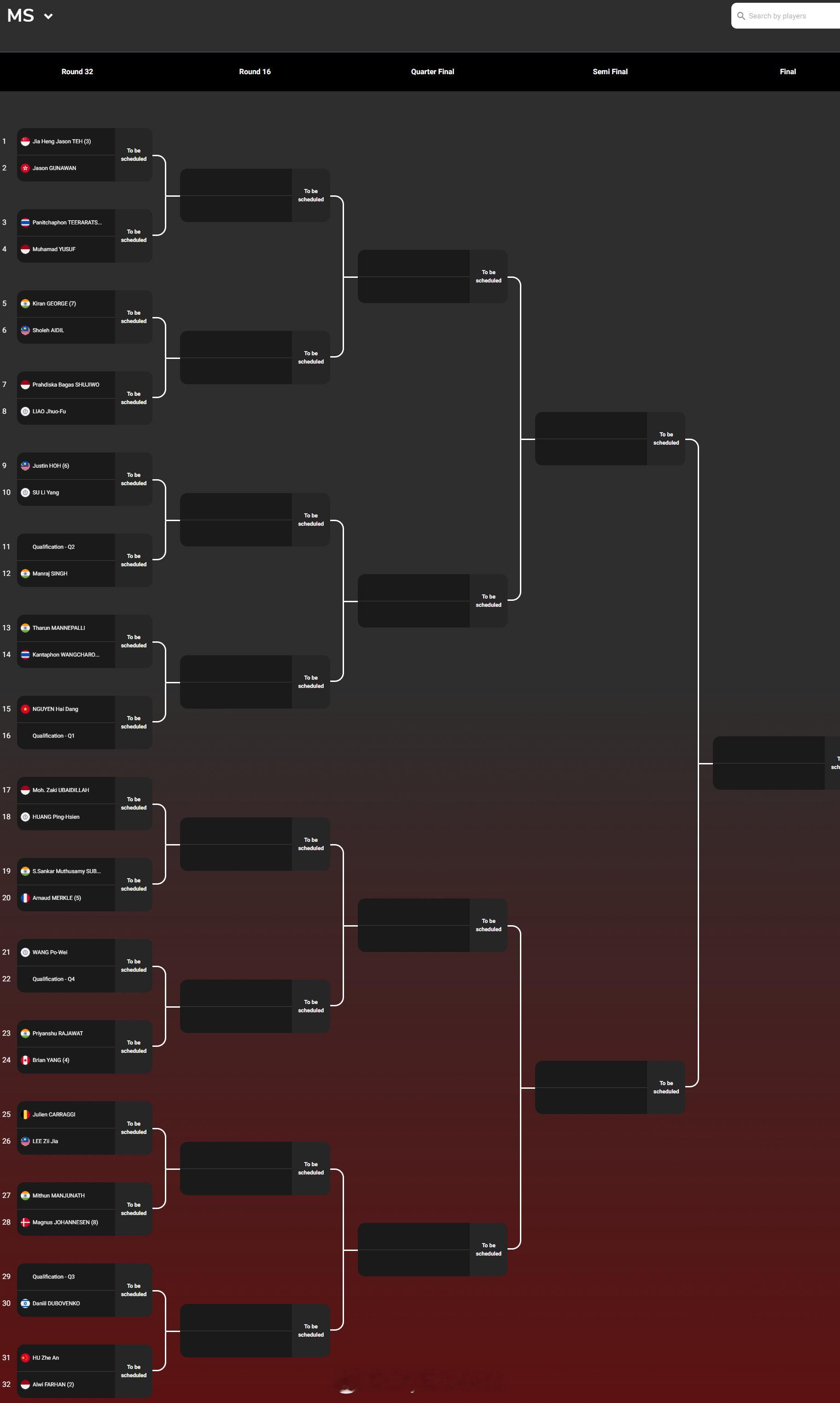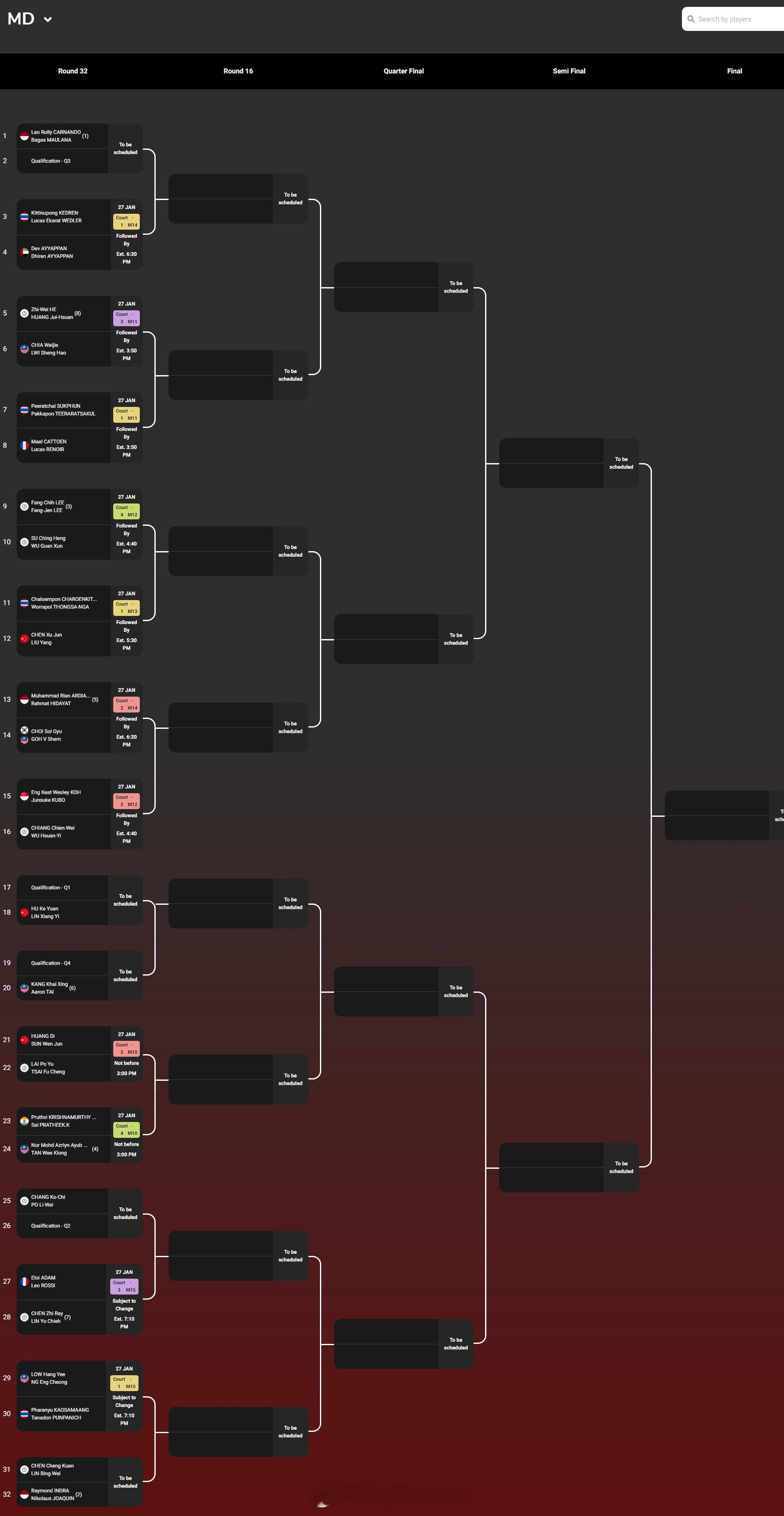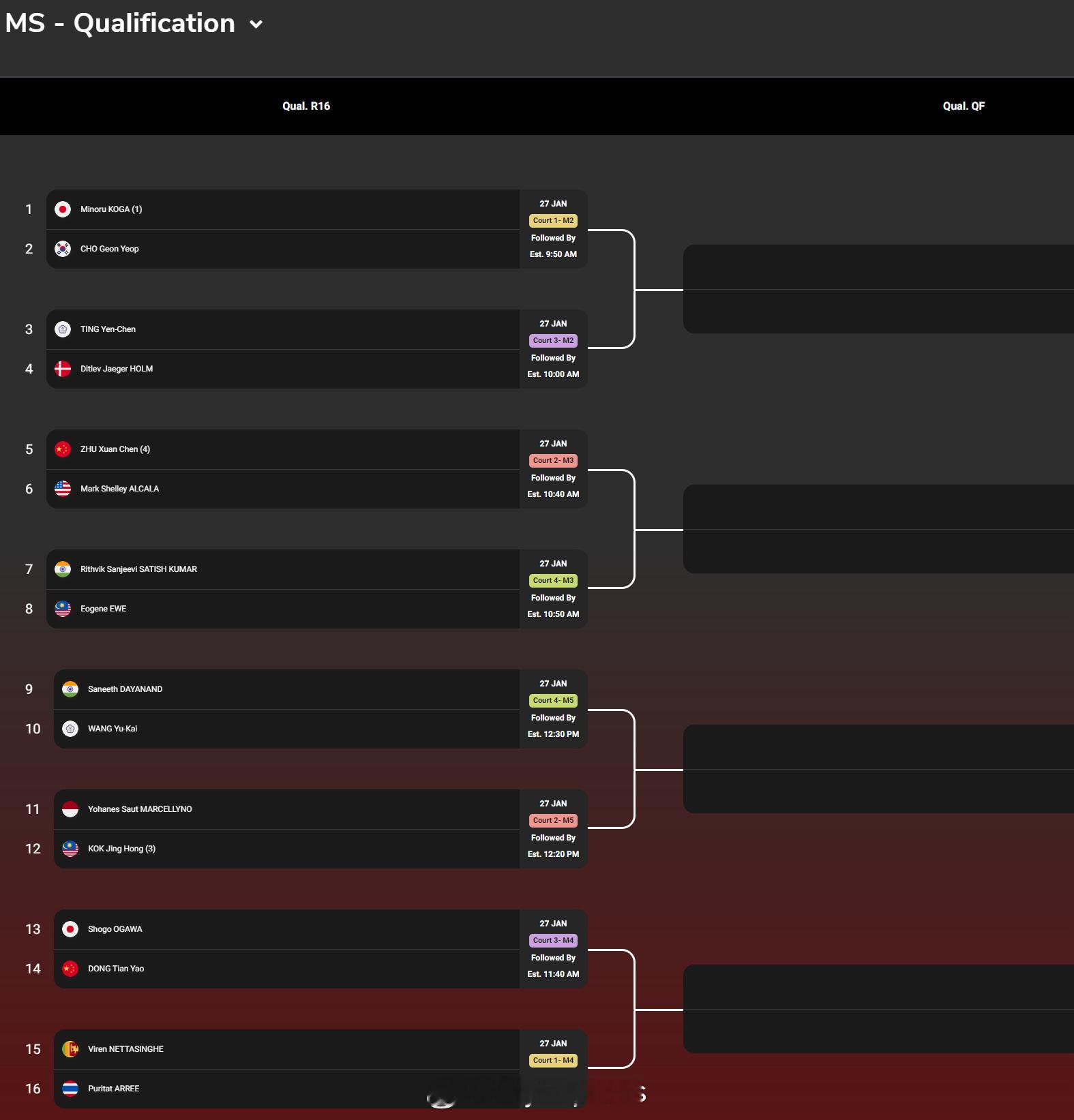 【2026泰国羽毛球大师赛签表】2026年泰国羽毛球大师赛羽联超级赛 1月27-2月1日,总奖金额为25万美元的2026世界羽联超级300泰国大师赛将在曼谷举行,国羽参赛名单如下(Q为资格赛选手),签表见图:男单:胡哲安、朱轩辰(Q)、董天尧(Q)女单:韩千禧男双:陈旭君/刘阳、胡珂源/林祥毅、黄荻/孙文骏、陈永锐/陈喆涵(Q)女双:鲍骊婧/李怡婧、坑姝良/李华洲、罗徐敏/王漪朵混双:程星/张驰、高家炫/吴梦莹、朱一珺/李茜