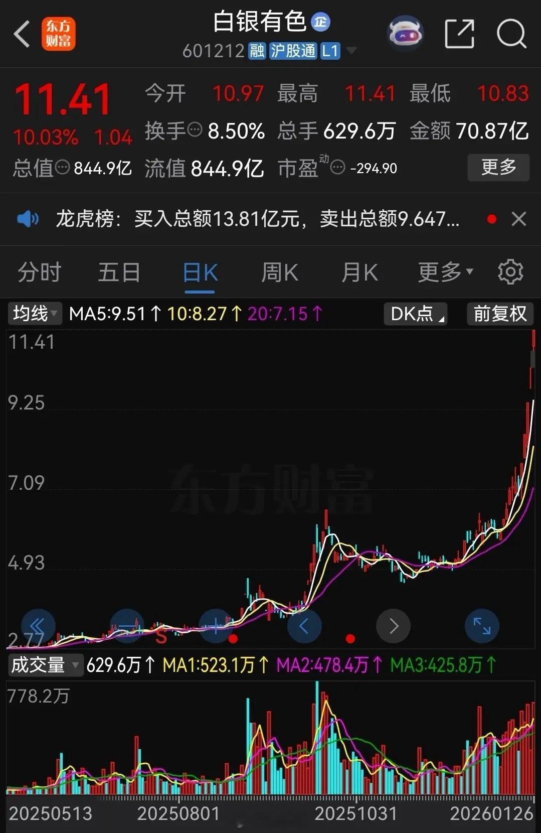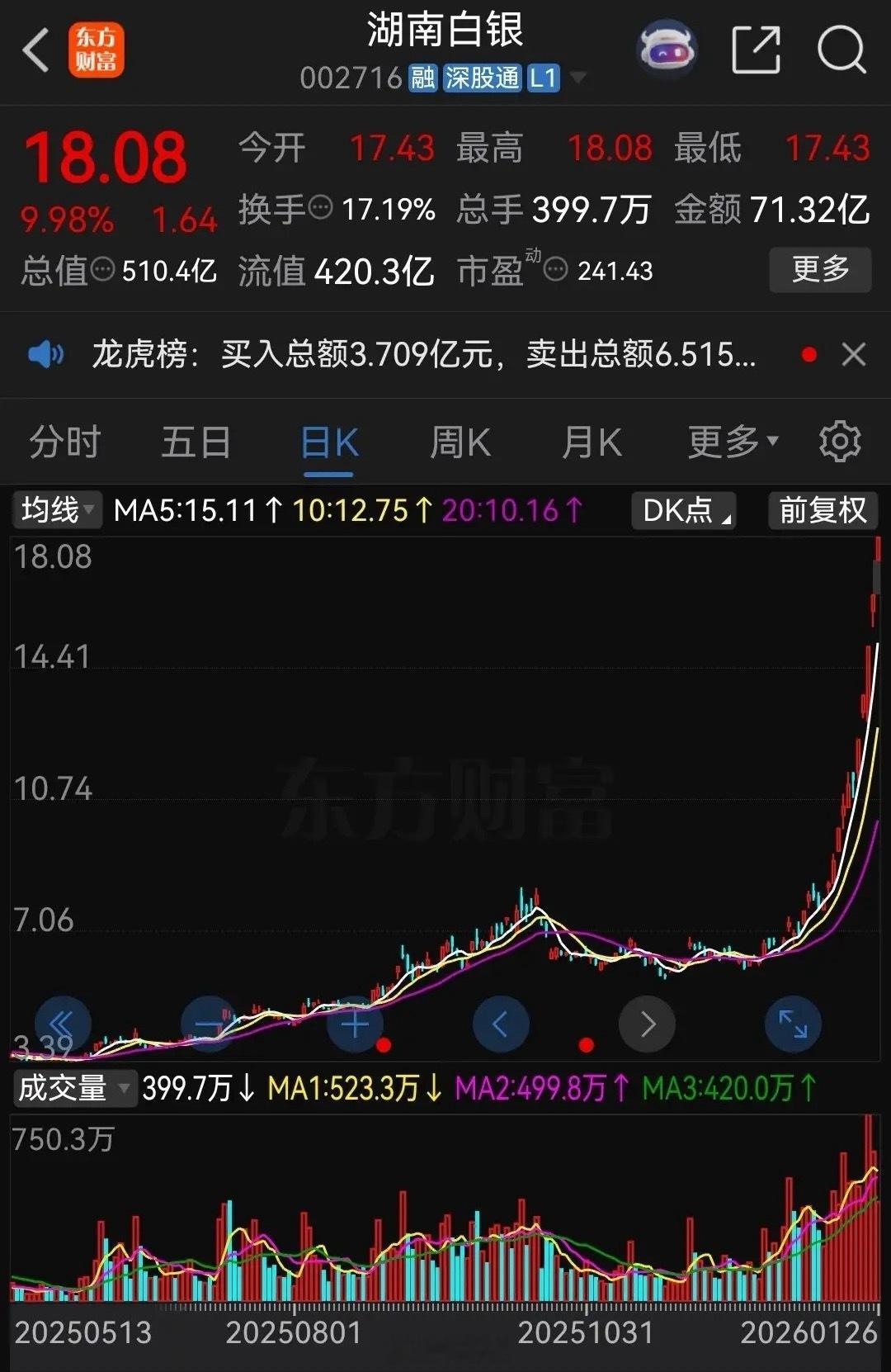 有色涨疯了!有色板块近一年来一直在走牛市,连个像样的调整都没有,几乎是一路单边上涨,指数从去年四月份关税贸易战时的低点已经涨了一倍多了。金、银、铜、铝、锌、钴、锂等各类小金属都挨个涨了一遍了。尤其是湖南白银和白银有色,这两只股票发了疯似的疯狂上涨,湖南白银历史最低价1.21元,今天最高涨到了18.08元,已经上涨了近15倍。白银有色也从底部上涨超过了5倍,虽然公司年报净利润亏损4.5亿元至6.75亿元,但今天根本不惧利空,仍然涨停报收。有色板块现在已经到了群魔乱舞的地步,前几年在底部布局有色板块的股民,将会是这波牛市的大赢家!