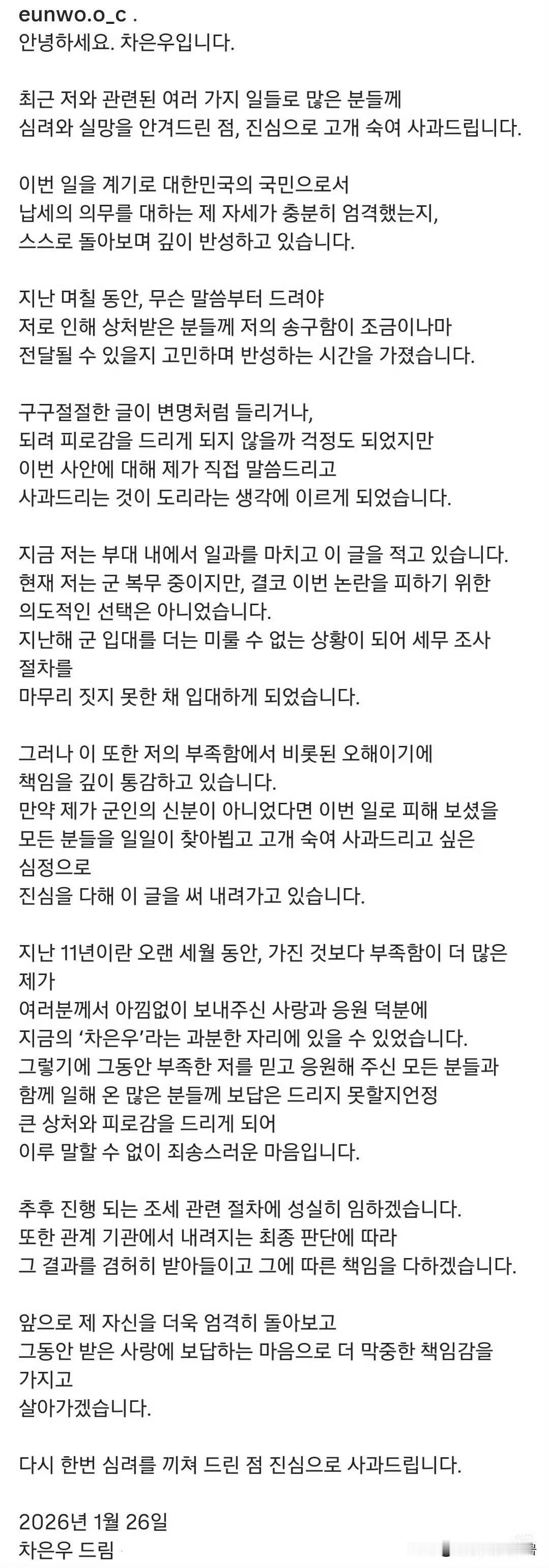 车银优,承认逃税。 1月26日韩国男星车银优通过个人Instagram发布长文首次承认税务责任,称“没有辩解的余地”,承诺配合调查并承担后果,但案件仍处于韩国税务部门行政审查阶段,最终是否构成逃税罪需等待2月底官方裁决。 韩国又塌房一个,没有塌在生活作风问题上没有塌在绯闻恋情上塌在了逃税上,这也是韩国民众绝不原谅的问题。一夜之间,“脸蛋天才”人设反转为“逃税天才”“税男一”等标签,韩网刷屏要求退圈封杀,新韩银行等至少5家代言品牌也紧急下架宣传内容。看来车银优要想翻身也很难了。 车银优