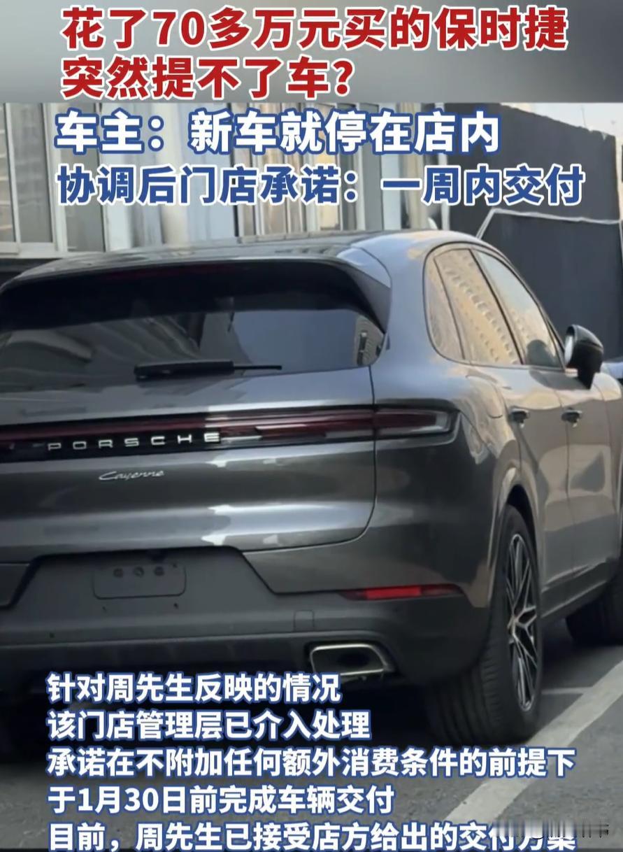 大快人心!湖北武汉,男子花70万购买了一台保时捷卡宴,万万没想到,车子到了,钱也交了,可销售却告知想提车可以,但需要再加价50000元选购装饰,男子当场就觉得离谱:我都开始还贷款了,你告诉我车子提不走? 周先生一开始看中的是2026款保时捷卡宴,裸车价74万多。 原本他打算全款拿下,销售却一个劲推荐贷款,说贷66万更划算。 想着销售懂行,周先生没多想就签了合同,付了意向金和首付,就等提车。 没过多久,银行短信提醒贷款已发放,他的还款账户也扣了第一笔月供。 销售还主动微信联系他,商量交车仪式的布置,连鲜花颜色都敲定了。 任谁看,这都是板上钉钉的顺利提车,没一点波折的苗头。 可就在交车前两天,销售突然变了口风,说车暂时交不了。 问具体时间,没个准信;问原因,也说得含糊其辞。 紧接着就抛出了两个选择:要么退车退款,要么再加5万买装饰配件。 周先生当场就火了,贷款都还上了,现在说提不了车要加价。 这不是明摆着坐地起价吗?他坚决拒绝加价,要求按合同办事。 双方僵持不下,周先生干脆找了媒体,一起去4S店讨说法。 面对镜头,销售才找了个借口,说是内部沟通和关单手续有问题。 这种说辞显然站不住脚,直到门店管理层出面,事情才出现转机。 最终对方承诺,不再附加任何条件,1月30号前必交车。 周先生接受了这个方案,这场提车风波总算有了交代。 可能有人觉得周先生幸运,遇到事能顺利解决。 但其实这种购车套路,很多人都可能碰到,只是金额大小不同。 销售推荐贷款时说的“更划算”,背后往往藏着提成猫腻。 他们靠贷款业务拿返点,至于消费者划不划算,反而不是重点。 而提车前加价,更是常见的霸王操作,尤其针对热门车型。 把加价包装成装饰费、服务费,本质上就是违规乱收费。 根据《汽车销售管理办法》,经销商不能在标价外额外收费。 周先生的坚持和媒体监督,刚好戳中了商家的软肋。 但不是所有人都有这样的运气,提前避坑才是关键。 首先签合同前,所有费用都要写进条款,模糊表述一概拒绝。 尤其是交付时间、违约责任,越具体越好,口头承诺不算数。 其次贷款购车别被“低月供”忽悠,要算清总利息和服务费。 提前还款的违约金、还款方式,都得明明白白写进贷款合同。 遇到商家坐地起价,别慌也别妥协,保留好所有证据。 聊天记录、合同、缴费凭证都存好,必要时找媒体或投诉。 12315市场监管热线、12345政务服务热线,都是维权渠道。 买车对普通家庭来说,是件花大心思的大事。 大家图的是踏实消费,不是提车前的糟心事。 商家靠套路赚钱,赢了一时利益,丢的是长久信誉。 毕竟诚信经营,才是留住客户的根本。 对此您怎么看?