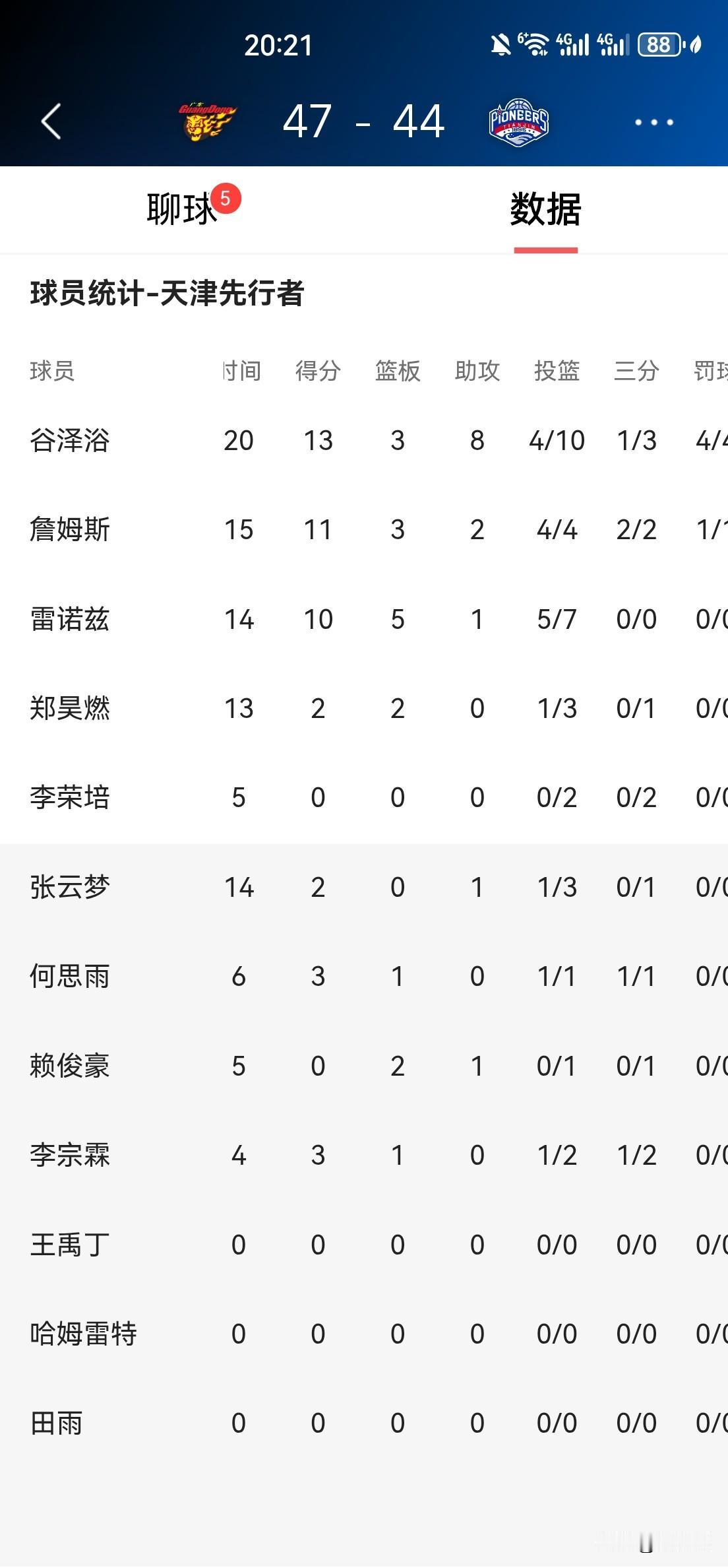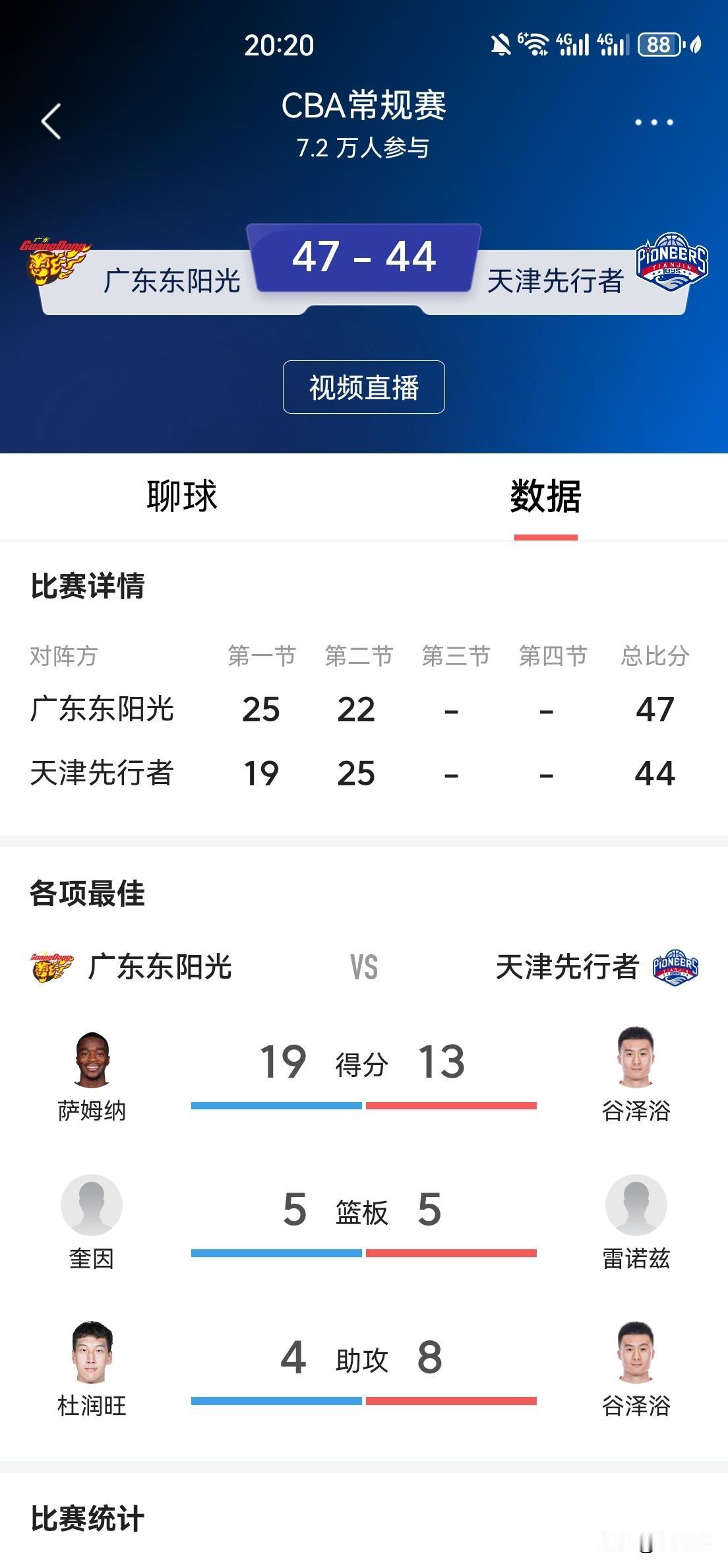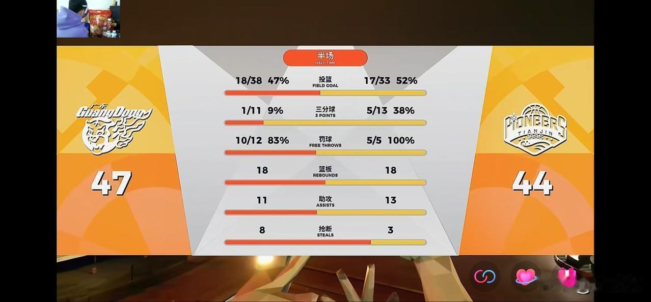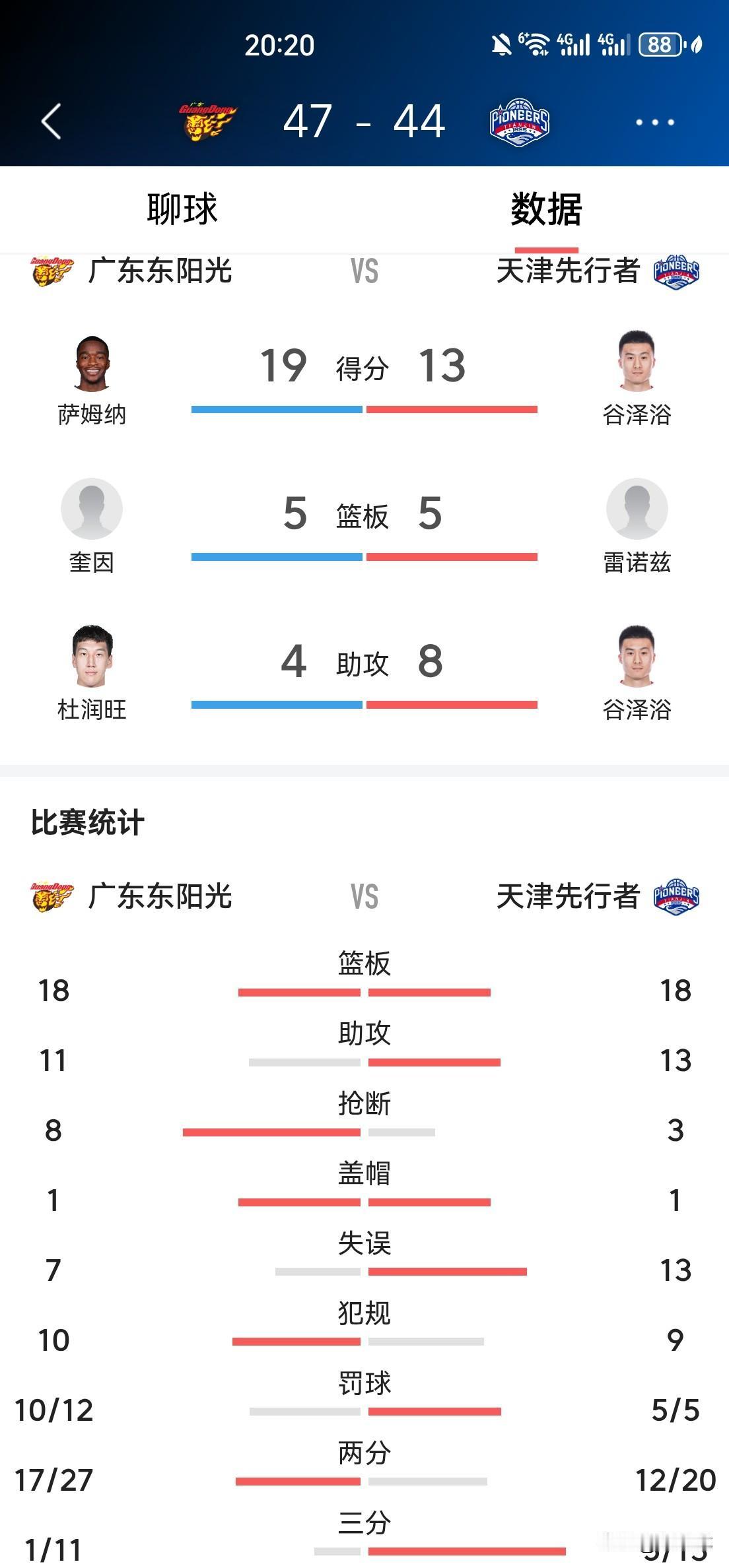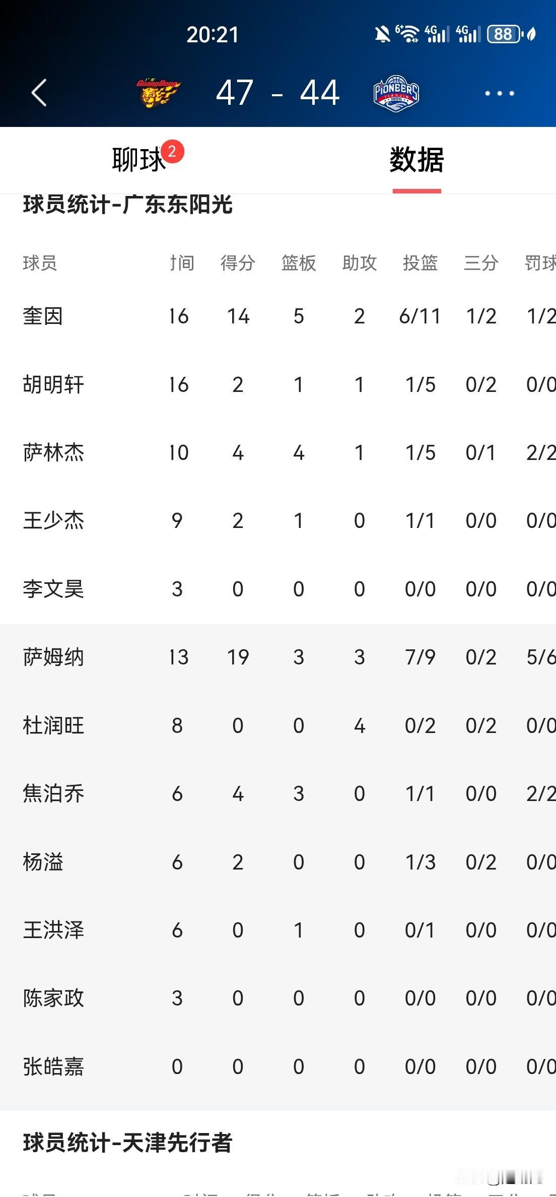 徐杰缺阵,萨姆纳、硅因火力全开,广东主场获胜无忧。 萨姆纳9投7中,砍下19分3篮板3助攻,硅因11投6中,拿到14分5篮板2助攻,胡明轩继续低迷,5投1中,仅得到2分2篮板1助攻。广东三分球全队哑火,11投1中,命中率仅9%。