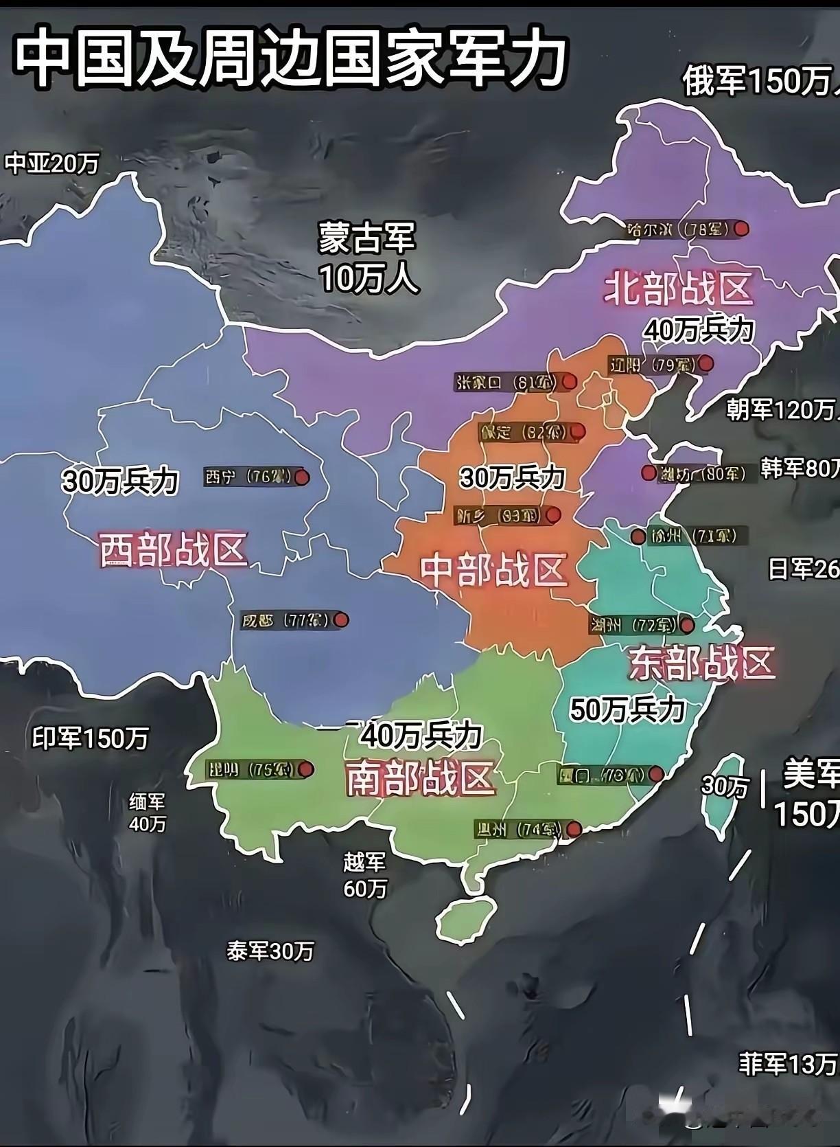 中国五大战区部队人数足以应付周边国家的威胁。印度军队虽然有150万人数,但是中印之间有喜马拉雅山脉作为天然险阻,西部战区足够应付。中南五国越南60万最具威胁,但是越南应该是没这个胆子了,其他的缅甸40万,泰国30万都小菜一碟。北部的蒙古国300万人口10万军人,不值一提。东部战区的威胁最大,有日本26万和美国的2万驻军,菲律宾13万,还有明进党的台独势力,都是反华的鹰犬和急先锋。东北亚南北朝鲜的200万也是个不稳定因素。