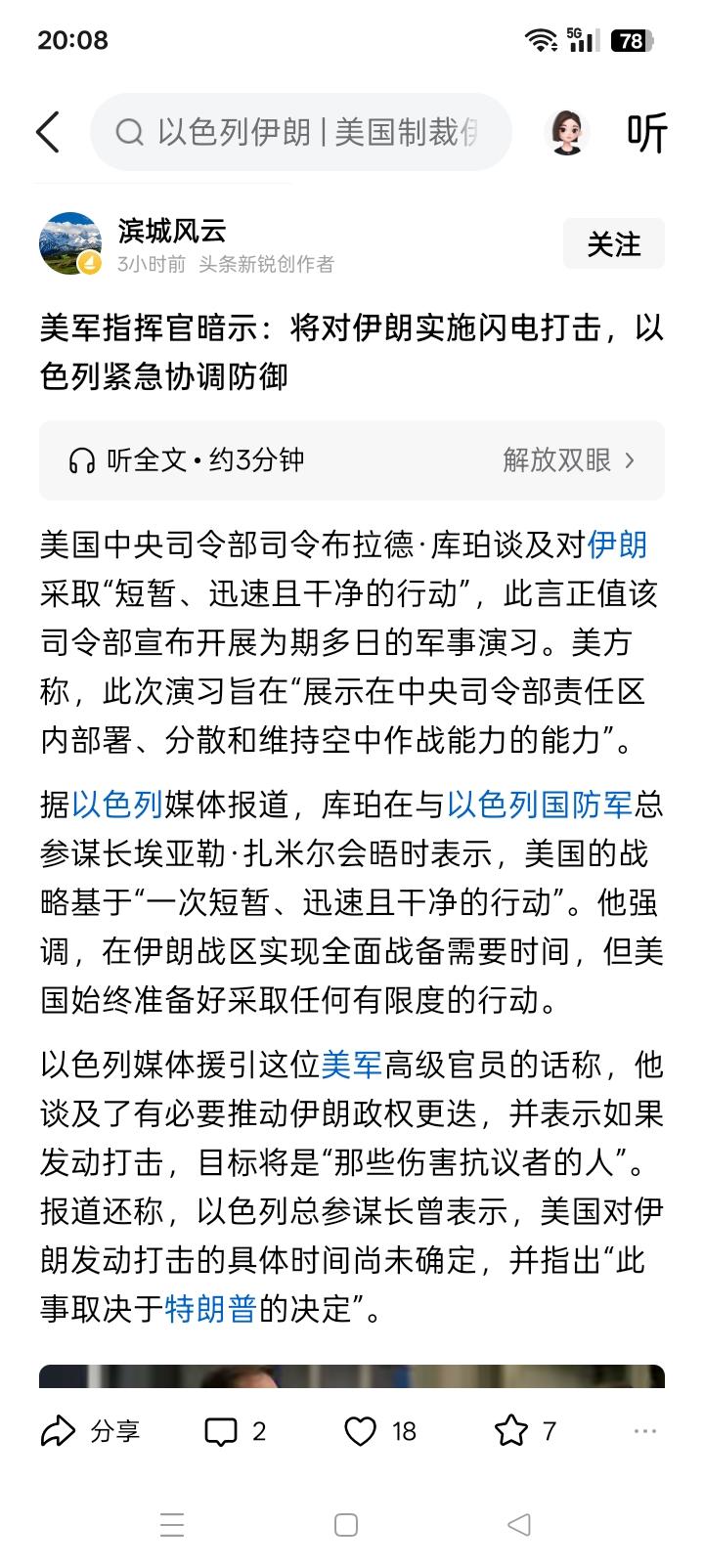 24、36小时? 当伊朗安全与外交政策委员会正式表示:“波斯湾将在24小时燃起战火”之后,又有来自来美国媒体的浇油添柴:“未来36小时内,美国、以色列和英国极有可能对伊朗发动联合空袭。” 美国媒体的主要根据是,美国向伊朗附近派遣了大批的军用飞机,包括各种战斗机和轰炸机,侦察机、加油机,以及非常先进的电子战飞机。并且,美国的“亚伯拉罕·林肯”号航空母舰战斗群,已经靠近伊朗海域。据说,伊朗也已经派出两艘潜艇和无人机进行侦察,甚至可能是迎战。 另外,美国中央军区司令部司令布拉德·库珀上将不仅访问了以色列,并且虽然不指名、但明确的表示:这将是一场“短暂、迅速且干净的行动”。 综合各方面的消息,似乎一场军事行动,也可能是一场大战,好像已经火烧眉毛,迫在眉睫。