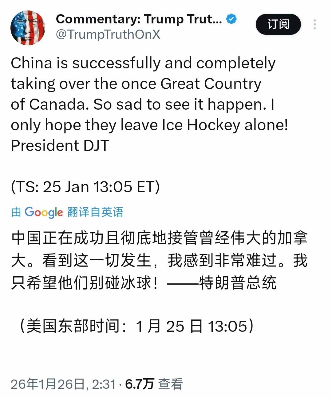 特朗普今天(北京时间1月26日)发文写道:“中国正在成功且彻底地接管曾经伟大的加拿大。看到这一切的发生,我感到非常难过。我只希望他们别碰冰球!” 中国真接管加拿大了吗?中国只不过与拥有主权国家加拿大恢复正常的贸易关系,根本与领土主权问题无关,却被特朗普夸张的描述为中国“接管”加拿大了。这样的污蔑说法是想让美国人民相信、还是加拿大人民信呢?然而,可能除了拿这事自导自演的特朗普外,相信有正常思维的人都不会相信。 其实,特朗普的行为只不过是“以小人之心度君子之腹”罢了,或许在特朗普的心目中,加拿大早已经是他“心爱”的美国第51州了。因此,别人不能碰、更不能摸,只要与加拿大有正常的贸易往来,他就“醋意”大发,胡乱指责、污蔑!然而,特朗普指责中国的行为,既缺乏依据更也缺乏尊重,这种谎言也容易成为世人的笑柄,最终受损的相信只会是美国的信誉。