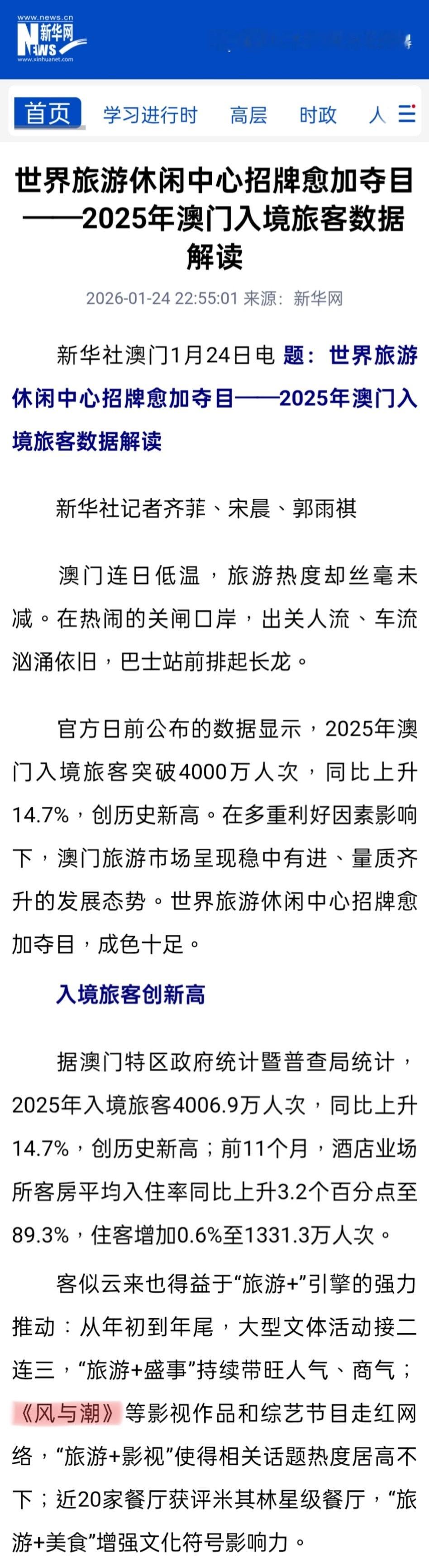任嘉伦《风与潮》获新华社官方肯定,剧中场景火爆出圈,成为旅客热门打卡地,助推澳门旅游热度上行📈