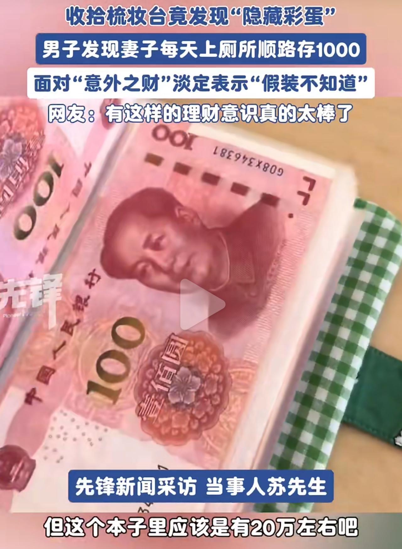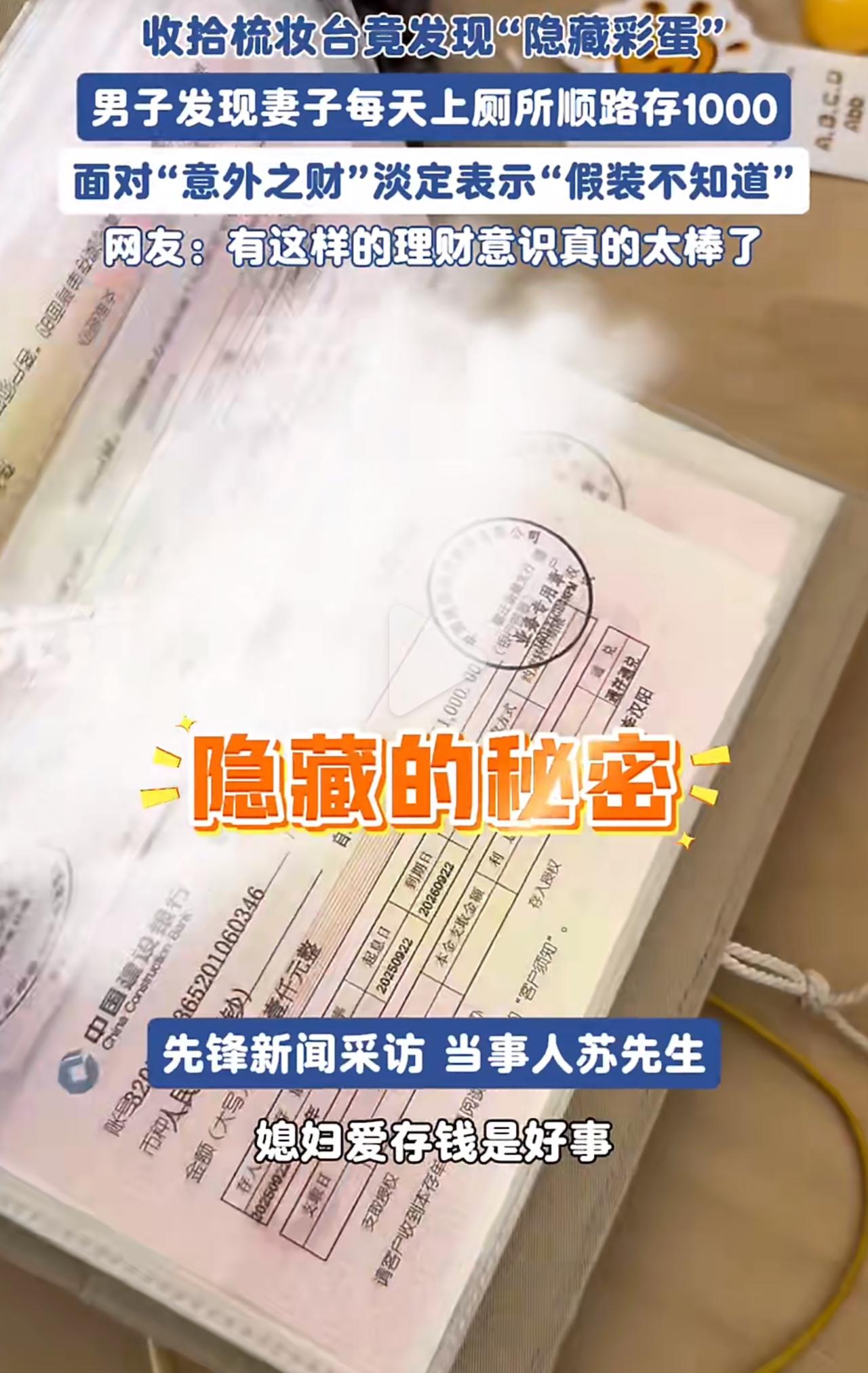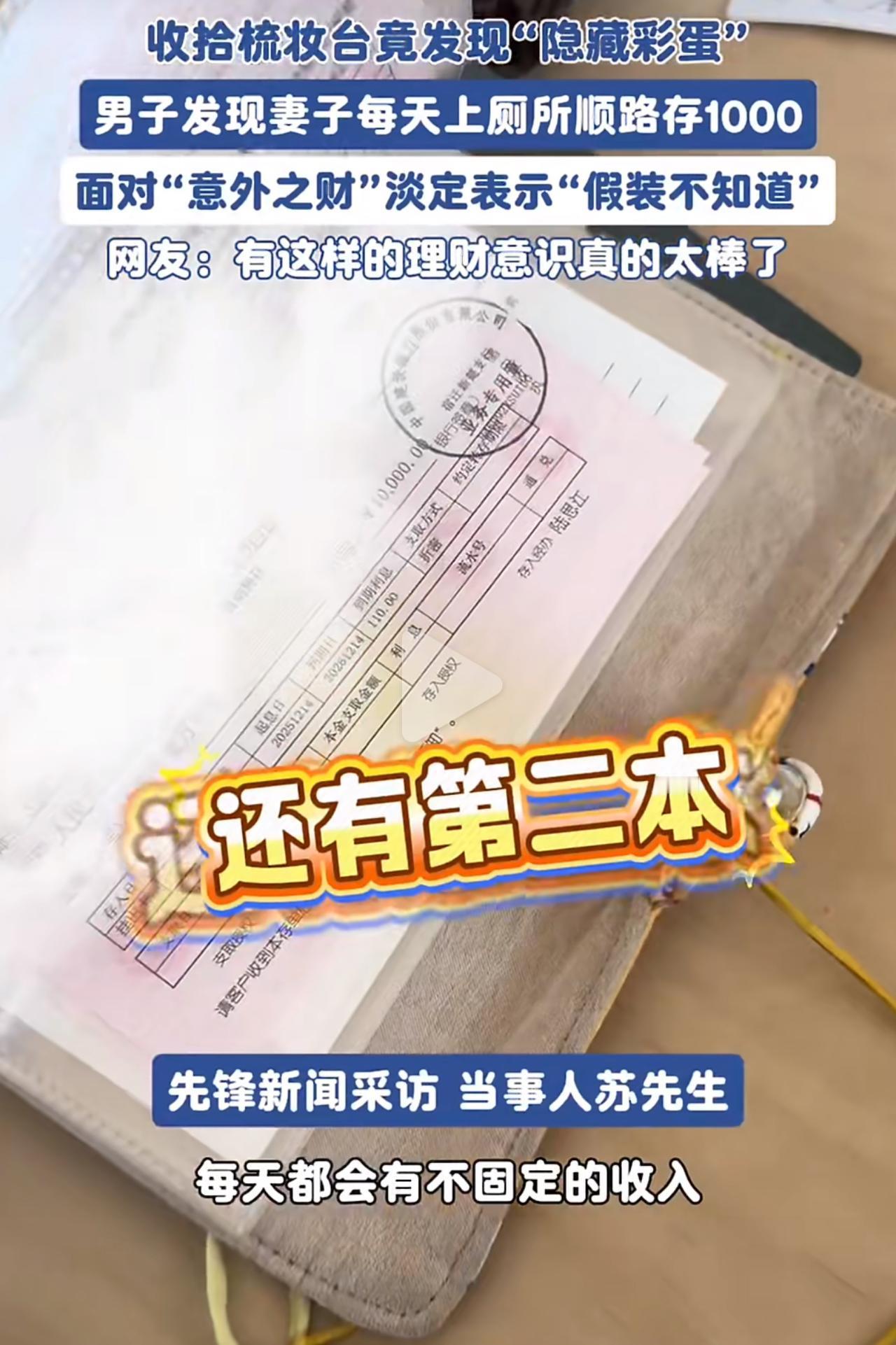 江苏宿迁这对小夫妻做个体生意,平时现金收入多,媳妇怕手里有钱随手花掉,从去年8月开始,每天借着上厕所的功夫,步行去隔壁银行存1000块。就这么一天天坚持,半年下来攒了200张存单,整整20万,都悄悄夹在记事本里,心里就想着给家里留笔应急钱,守着这份小积蓄,日子过得特别踏实。 老公发现后,嘴上满口答应着“我尊重你,啥也不问”,结果一转头,就把存单照片、每天存一千的细节全交给了媒体,愣是让这事全网都知道了。他可能觉得这是件值得分享的新鲜事,却压根没琢磨,这份看似无心的曝光,不仅没尊重媳妇的心意,还把家里的财务隐私全抖了出去,指不定引来借钱的、搞诈骗的麻烦。 这事一出来,网友直接炸开了锅。有人猛夸媳妇太自律,一天存一千能坚持半年,妥妥的民间理财高手,也有人怒批老公太双标,假尊重真越界,把夫妻之间的小默契,当成了博流量的噱头。 说到底,媳妇拼着极致的自律攒钱,本意是为了给家里兜底,而婚姻里的钱的事,从来都不是要绝对透明。留点彼此的边界感,守着那份互相体谅的善意,远比一时的流量热闹重要得多,毕竟夫妻同心,才是一个家最稳的底气。赚钱和存钱哪个更重要 男子发现妻子每天上厕所顺路存1000 个体户