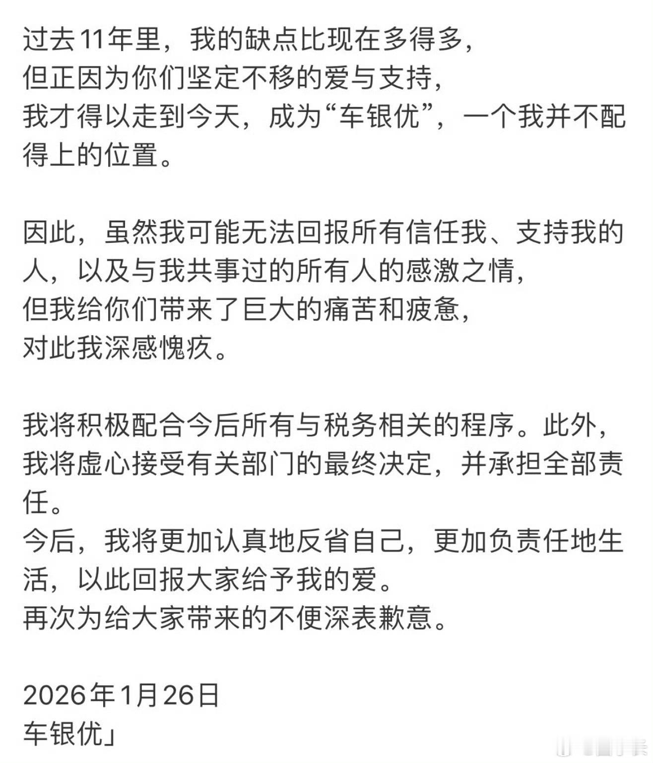 车银优承认逃税遇到问题不逃避,及时出来澄清,不愧是大家喜欢的车银优~他自己也发文对因此事件受到影响的人表达了歉意,相信大家对他的发文都有自己的判断!